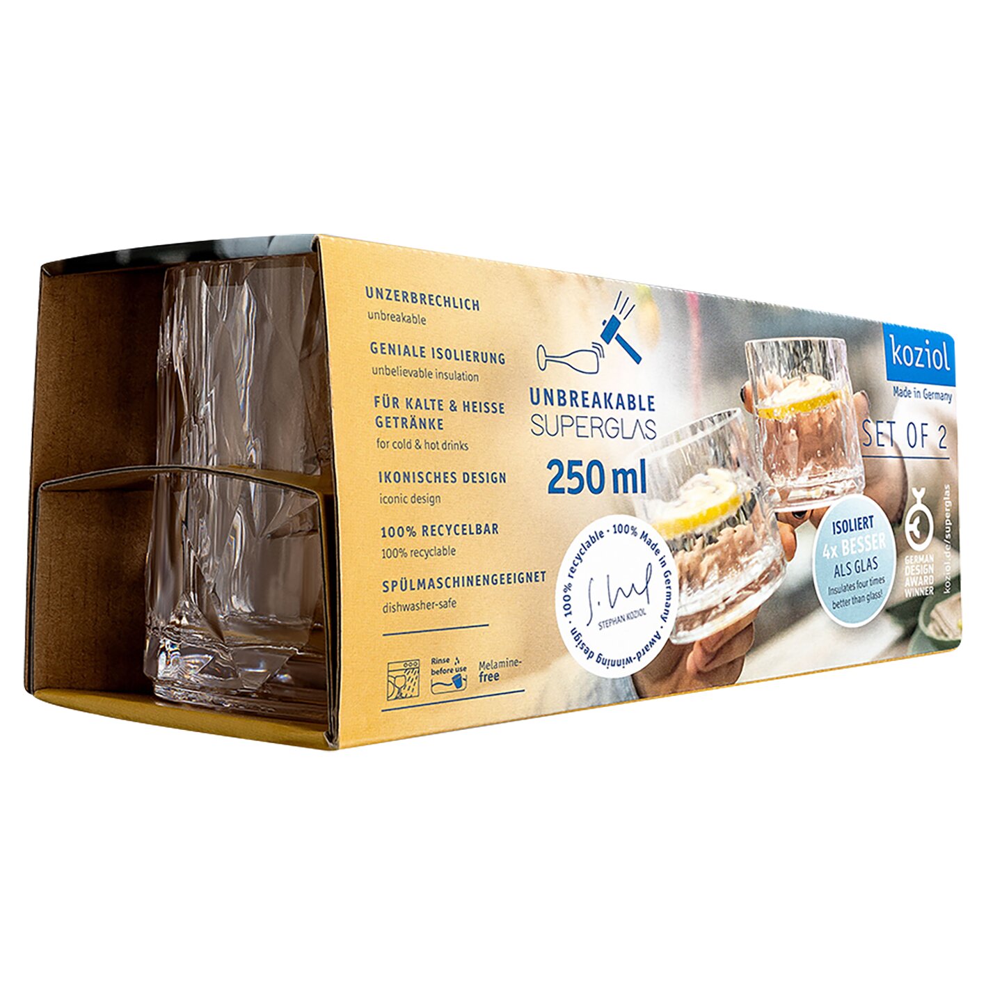 The super glasses by koziol are perfect for camping holidays, weekend trips and garden parties. Almost unbreakable and quite scratch-resistant, they insulate four times better than conventional glasses. Dishwasher-safe and environmentally friendly. Perfect for cold and hot drinks. Melamine-free.
