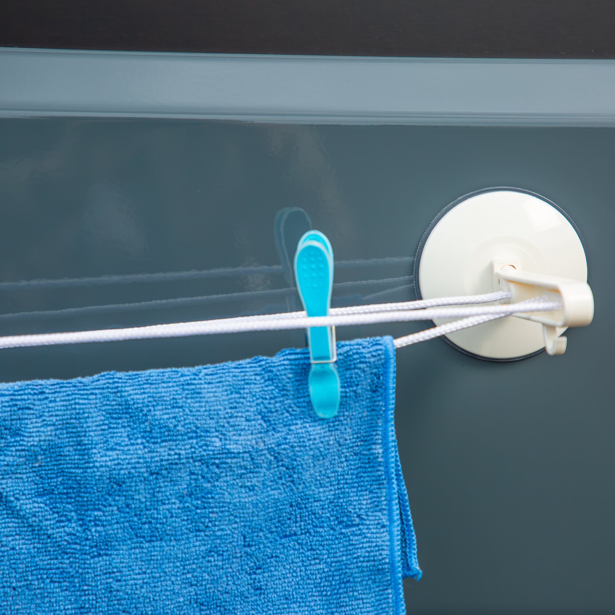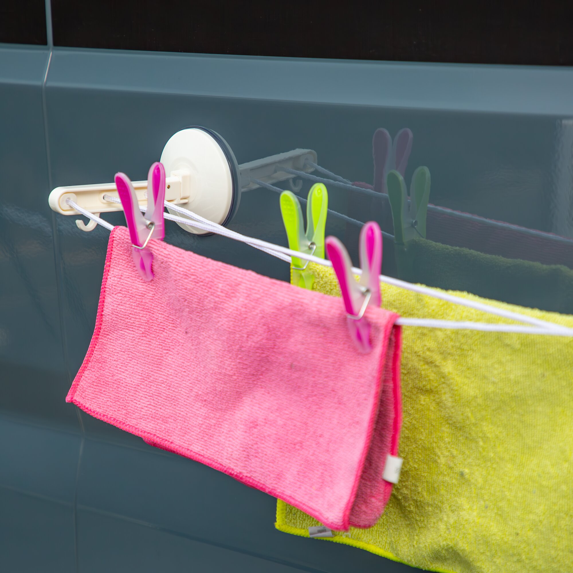 Drying rack with suction cups, easy to attach to smooth surfaces.