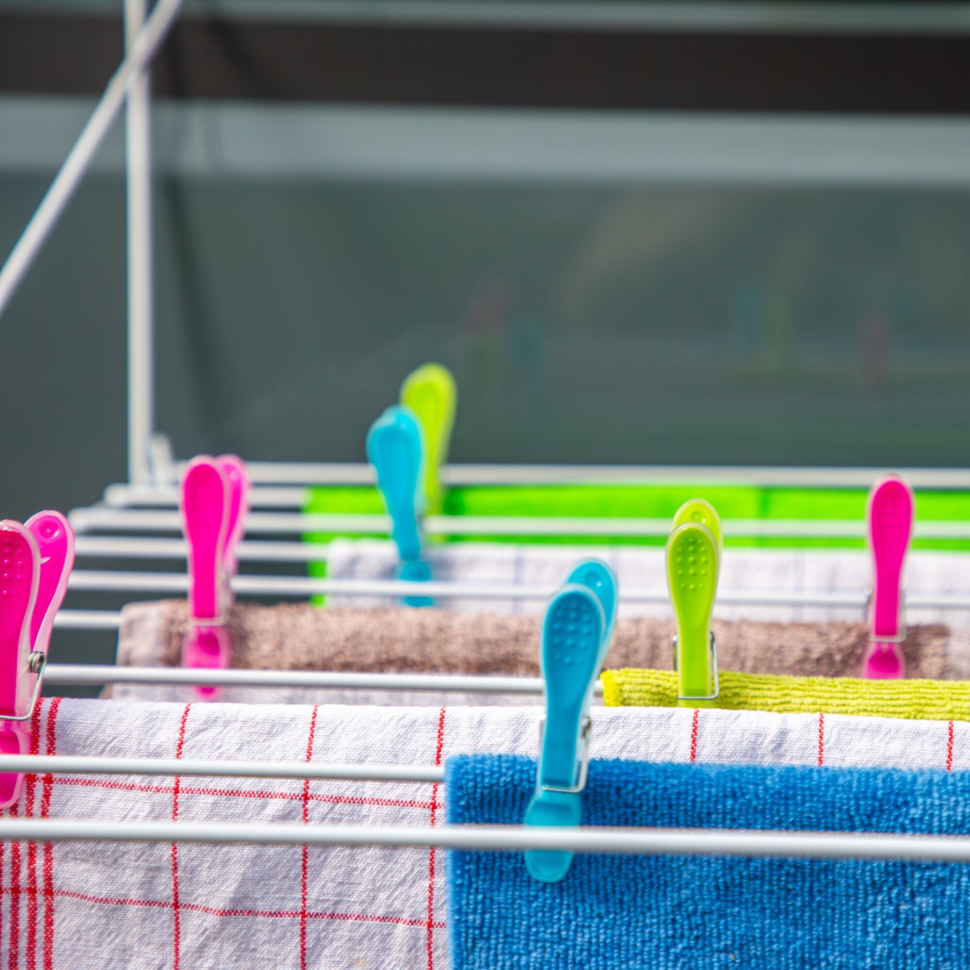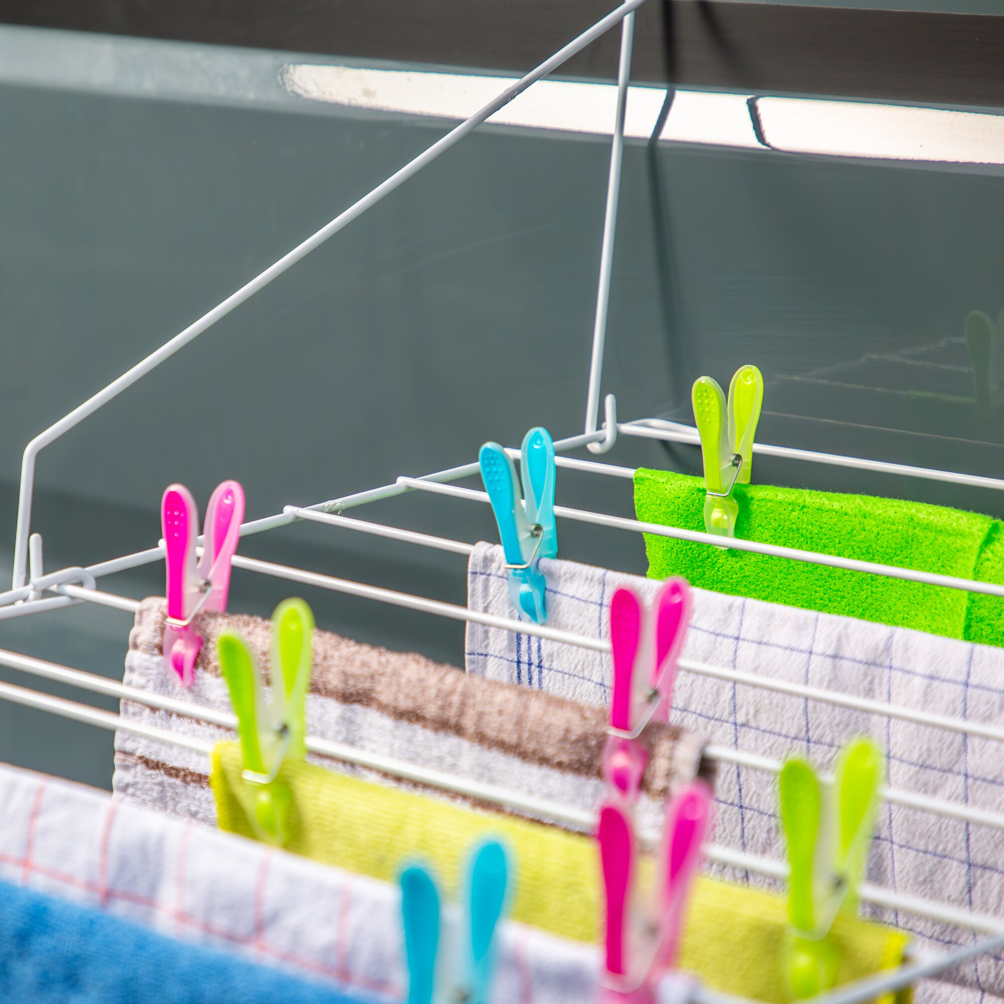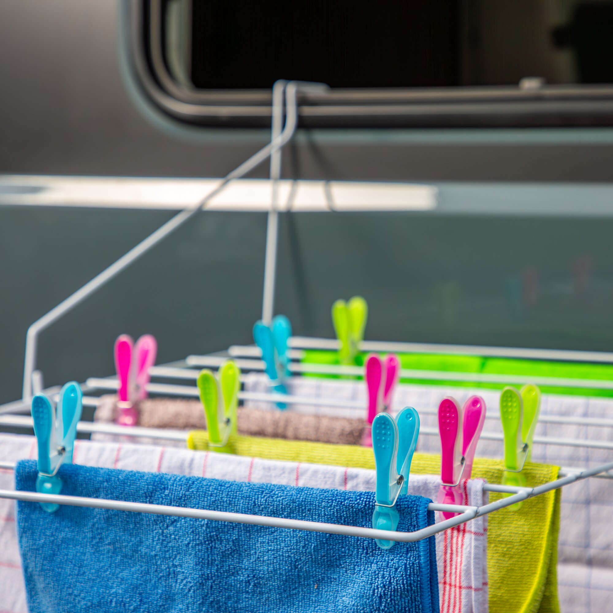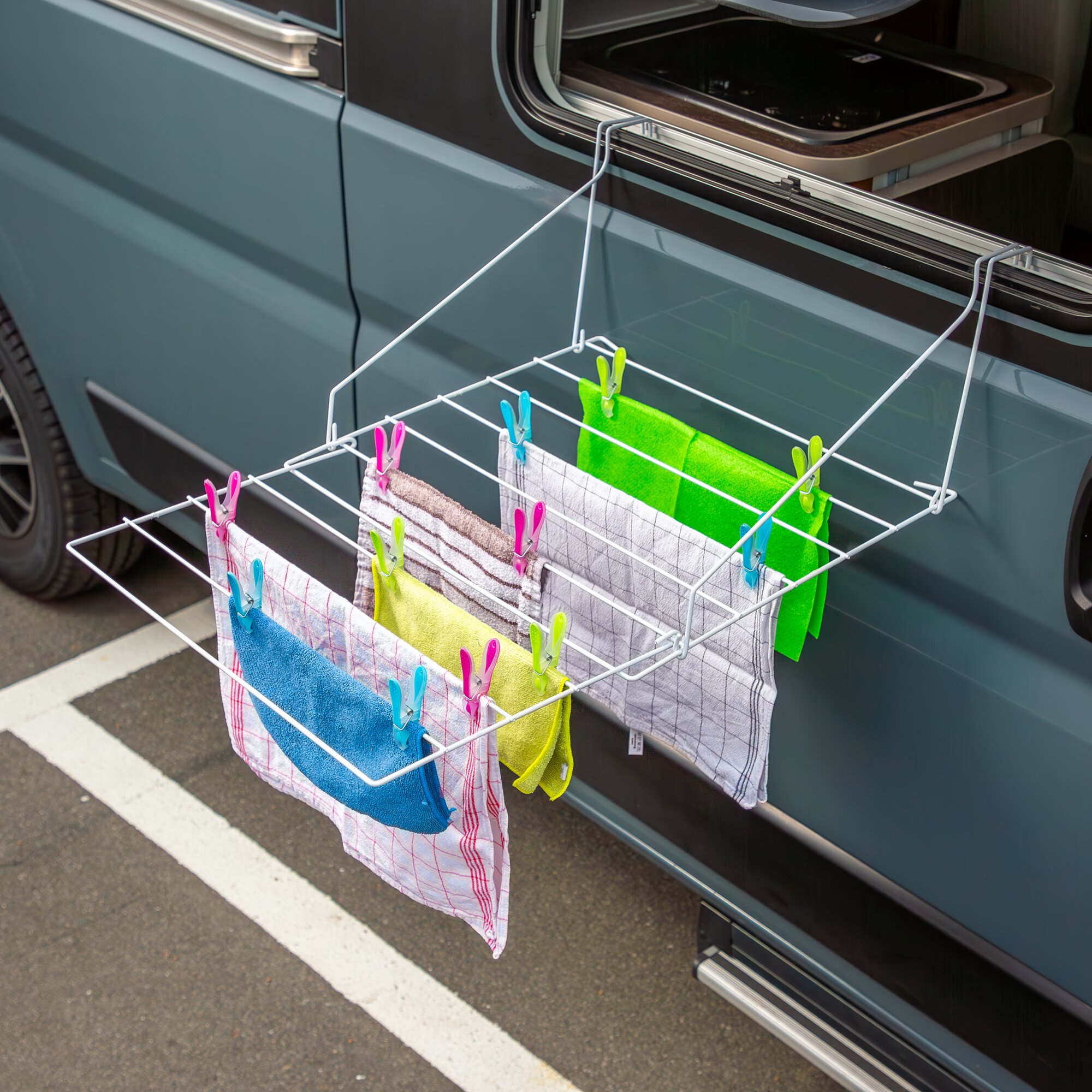 Drying rack for caravan windows, pull handles or balconies. Replaces an approx. 5.4 m long line. Rust-proof due to plastic coating.