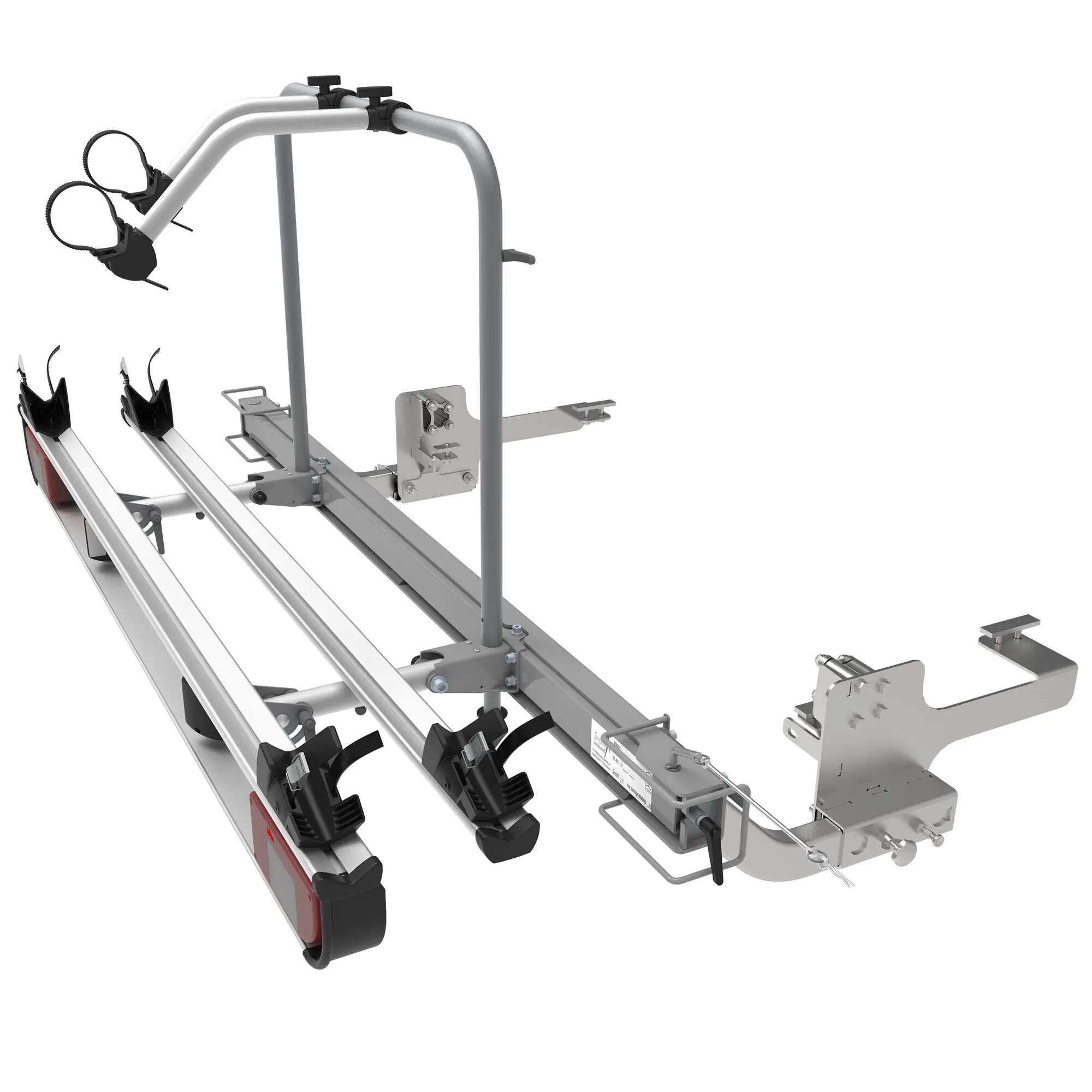 This carrier was specially developed for e-bikes and can be tilted when loaded. This gives you open access to both rear doors. When the carrier is not being used, the crossbeam can be tilted to the top to save space. The carrier is bolted directly to the chassis of the vehicle via an adapter. Installation should always be carried out by an authorised retailer (Please note: not compatible with vehicles with a length of 6.2 m and 6.4 m!).