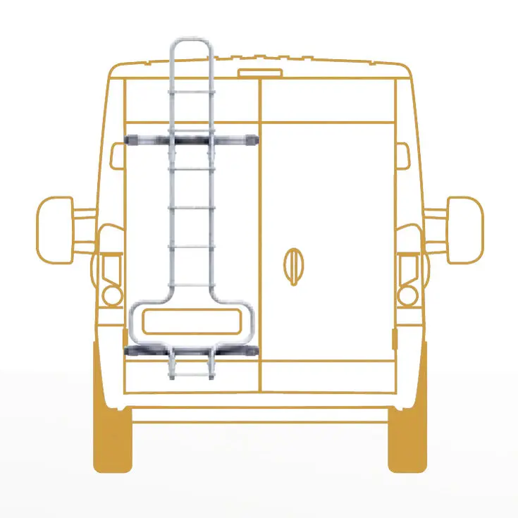 Ladder with 7 steps, completely pre-assembled, pre-shaped number plate gap, attached to the left rear door. Clear span of steps: 22 cm.