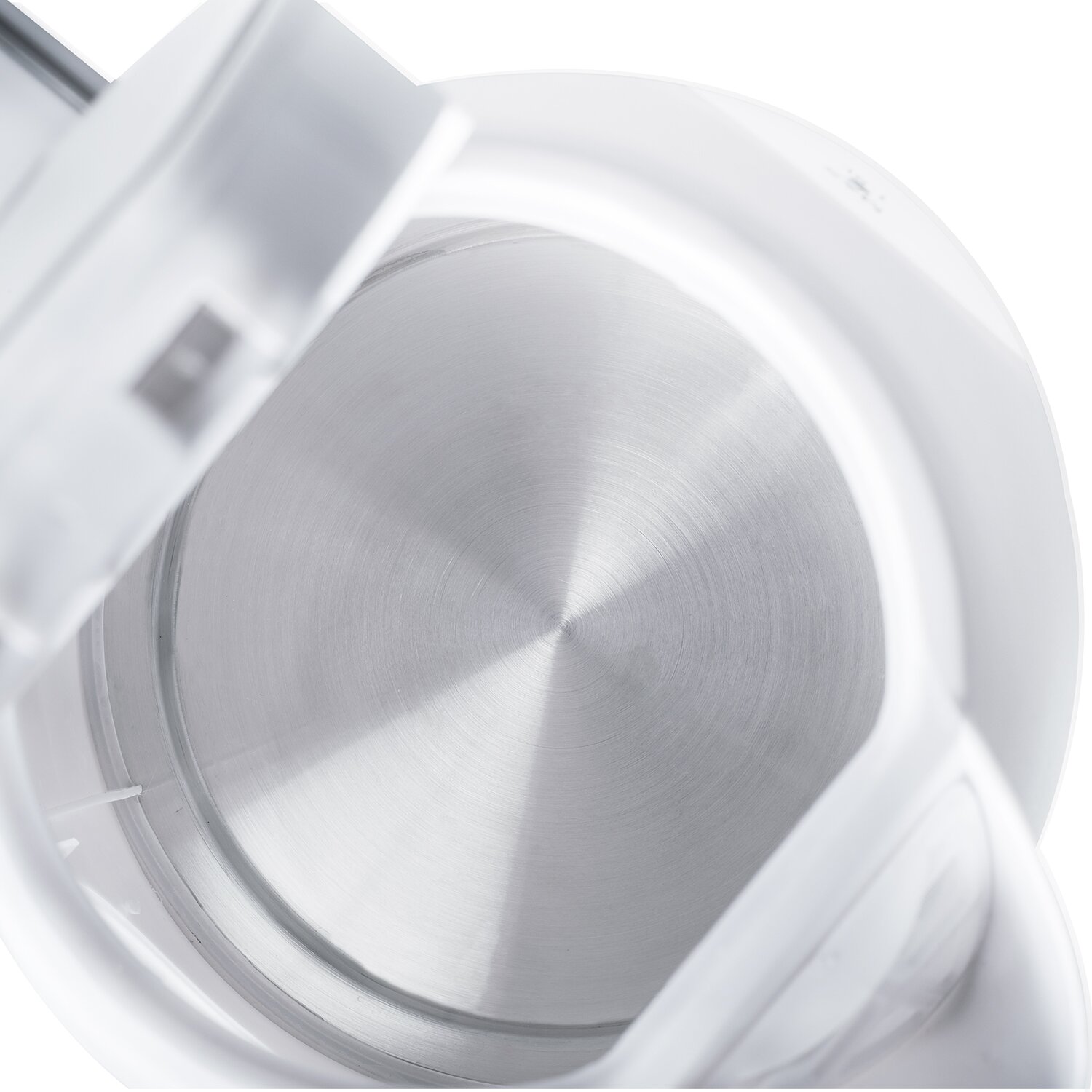 Modern, white kettle with a capacity of 1.5 l. Equipped with an on/off switch in the handle, a control lamp and a filter. It is very easy to pour out the water. The kettle can be removed from the base.