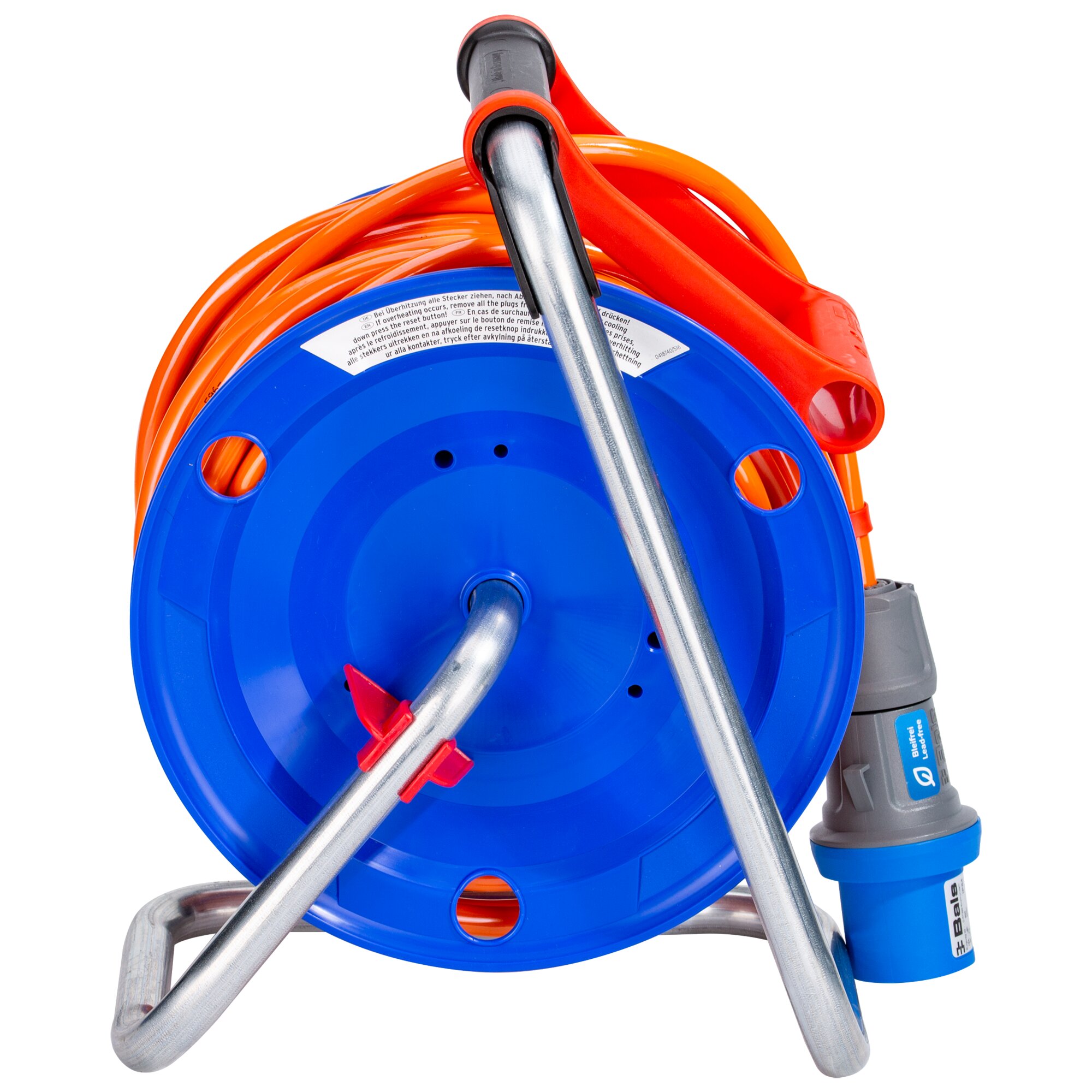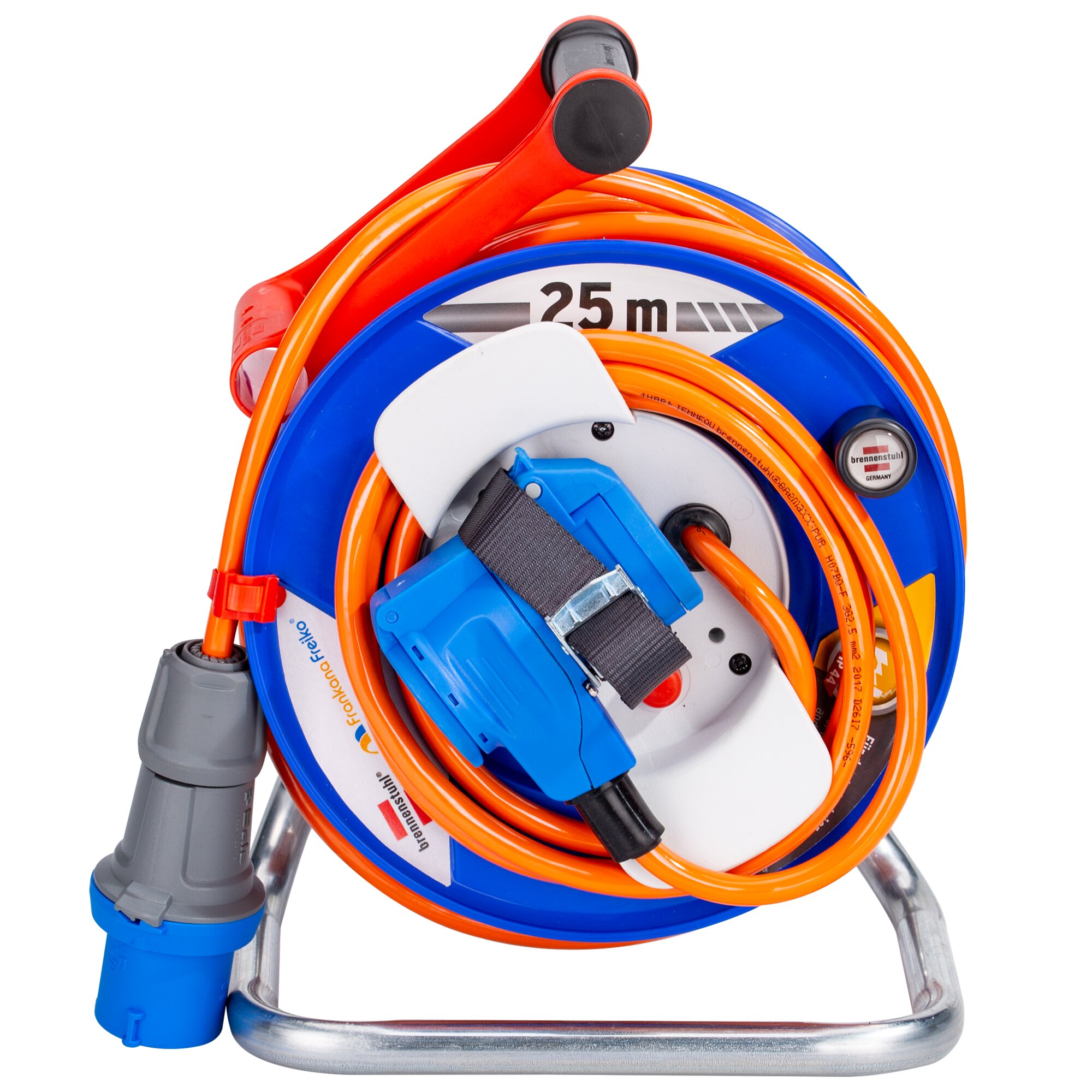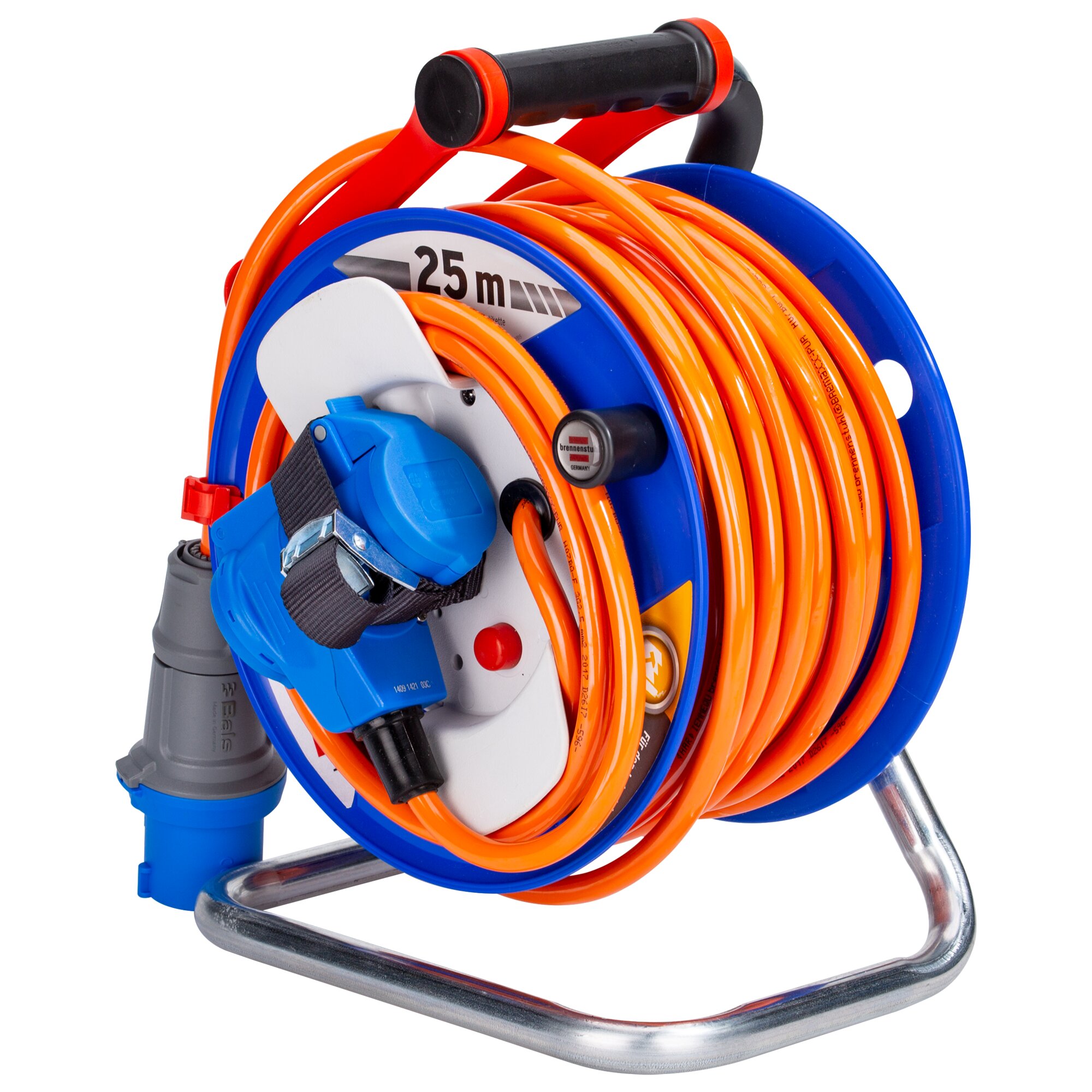 The extremely small cable reel convinces with quality and safety. Extension cable: 25 + 2 m, H07BQ-F3G2.5, CEE-CEE/Schuko. It is ideal for permanent use on campsites. The innovative Cable Pilot carrying handle ensures perfect cable routing and also makes it easy to carry and hang up the CEE cable reel.