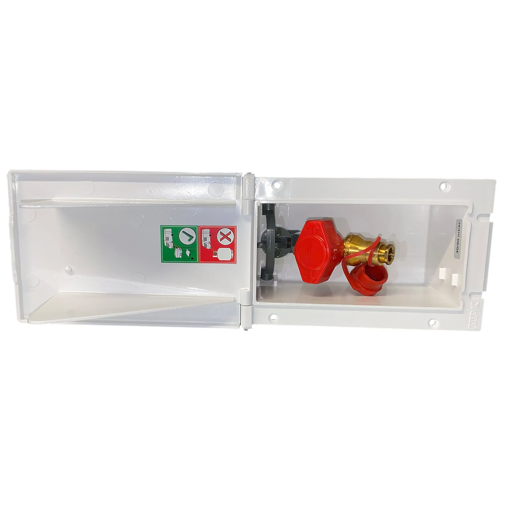 Box for installation in the outer wall. With quick-action valve according to DVGW regulations. Can be used for 30 mbar and 50 mbar.