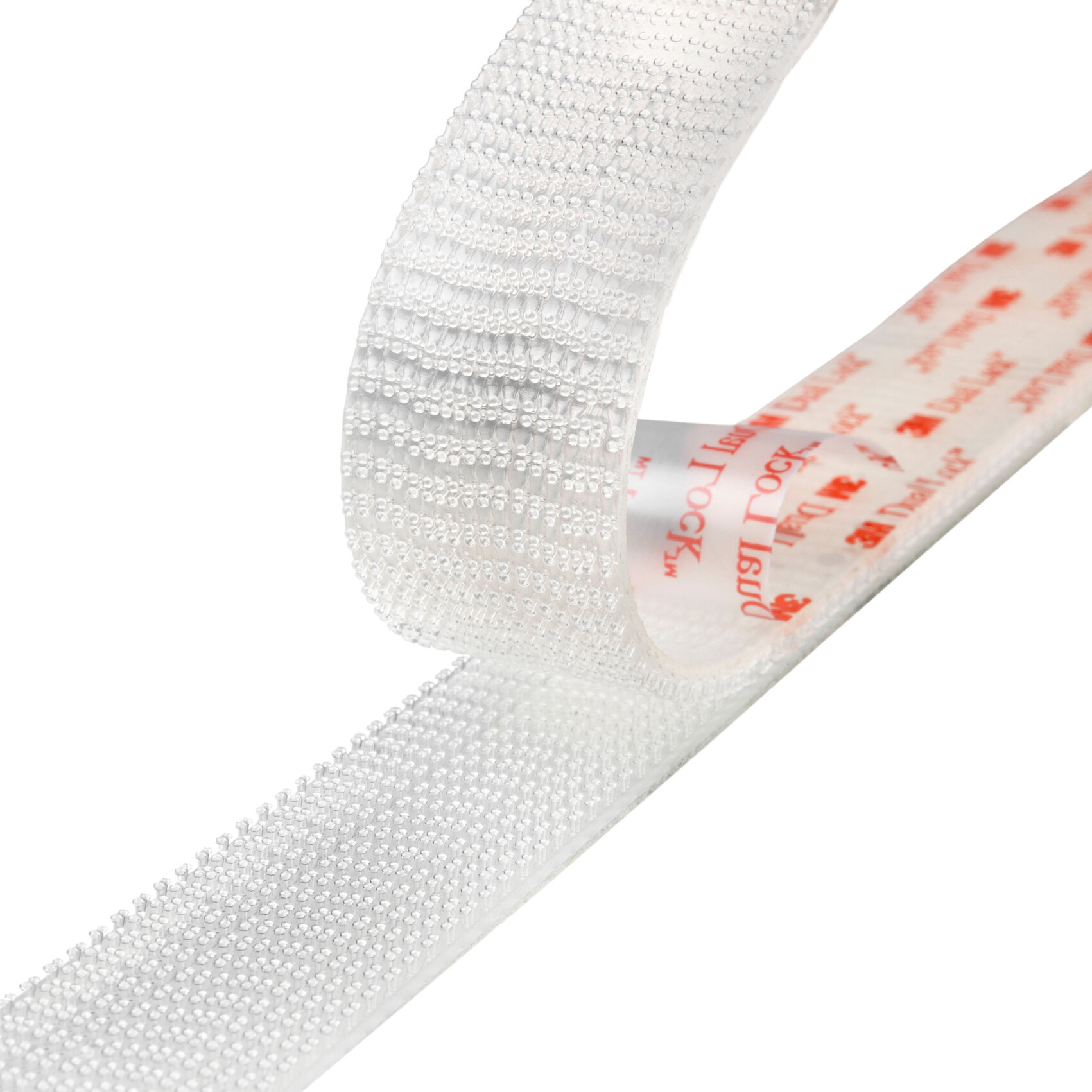 Removable, transparent fastening system. Replaces traditional mechanical connections like screws or drillings. Self-adhesive back for easy and tool-free installation. Can be opened and closed up to 1000 times. Waterproof. Suitable for indoors and outdoors. Four stripes, each 1.9 x 10 x 0.35 cm.