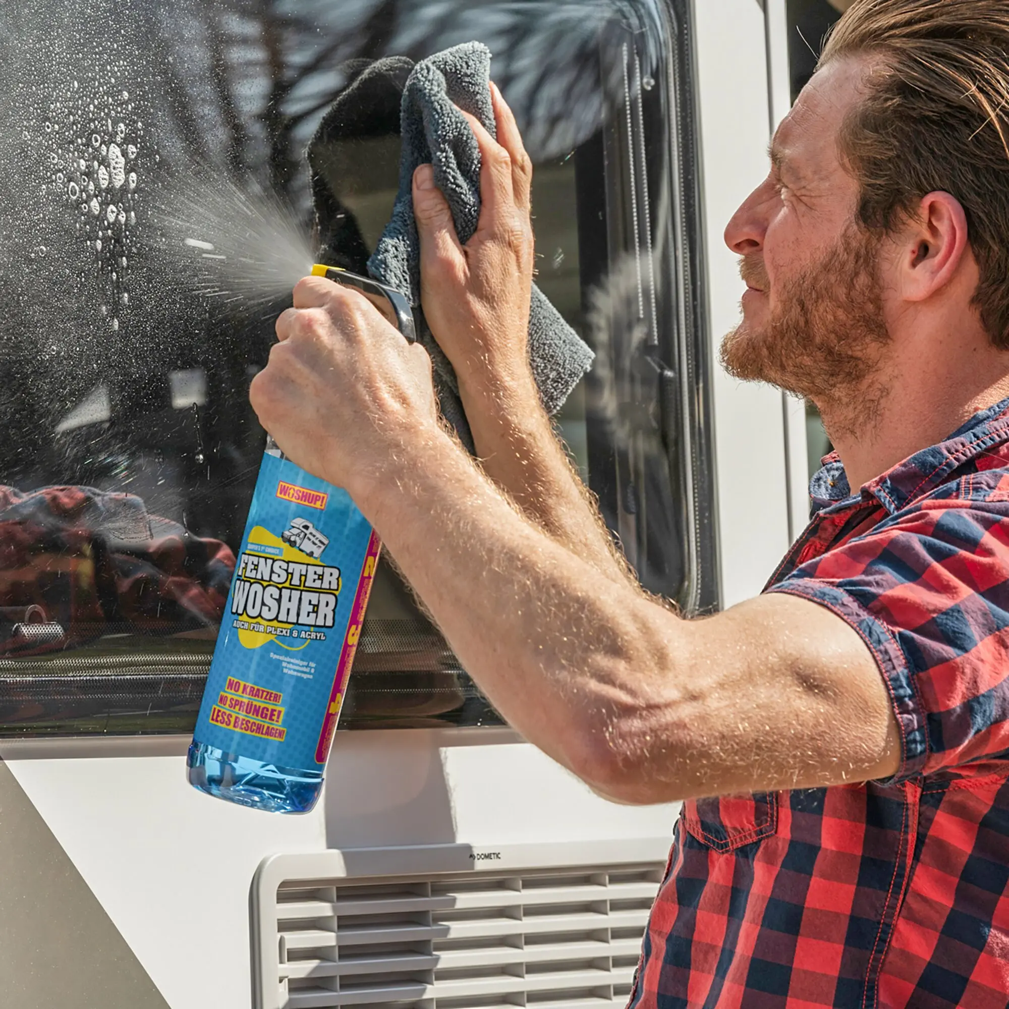 This window cleaner impresses with its scientifically certified polycarbonate compatibility, which prevents stress cracks in acrylic and plastic windows. Its unique Xtra Skin effect reliably protects against rapid fogging. Additionally, the window cleaner is biodegradable.