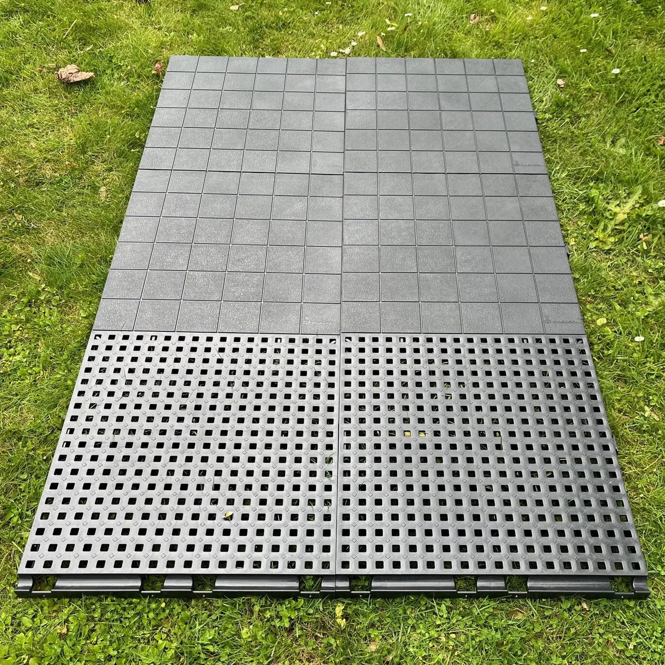 The perforated floor tile IsabellaFloor offers numerous advantages. Thanks to the honeycomb structure on the underside, these tiles are very stable and can be easily cut to any size without losing stability. Openings allow, for example, the installation of electrical wiring beneath the tiles. Installation is very quick and easy without tools, as the individual tiles simply interlock like building blocks. To avoid tripping edges, there are also slanted pieces and corners as finishing edges. This not only provides an attractive finish but is also practical, for example, for wheelchair users and families with prams.