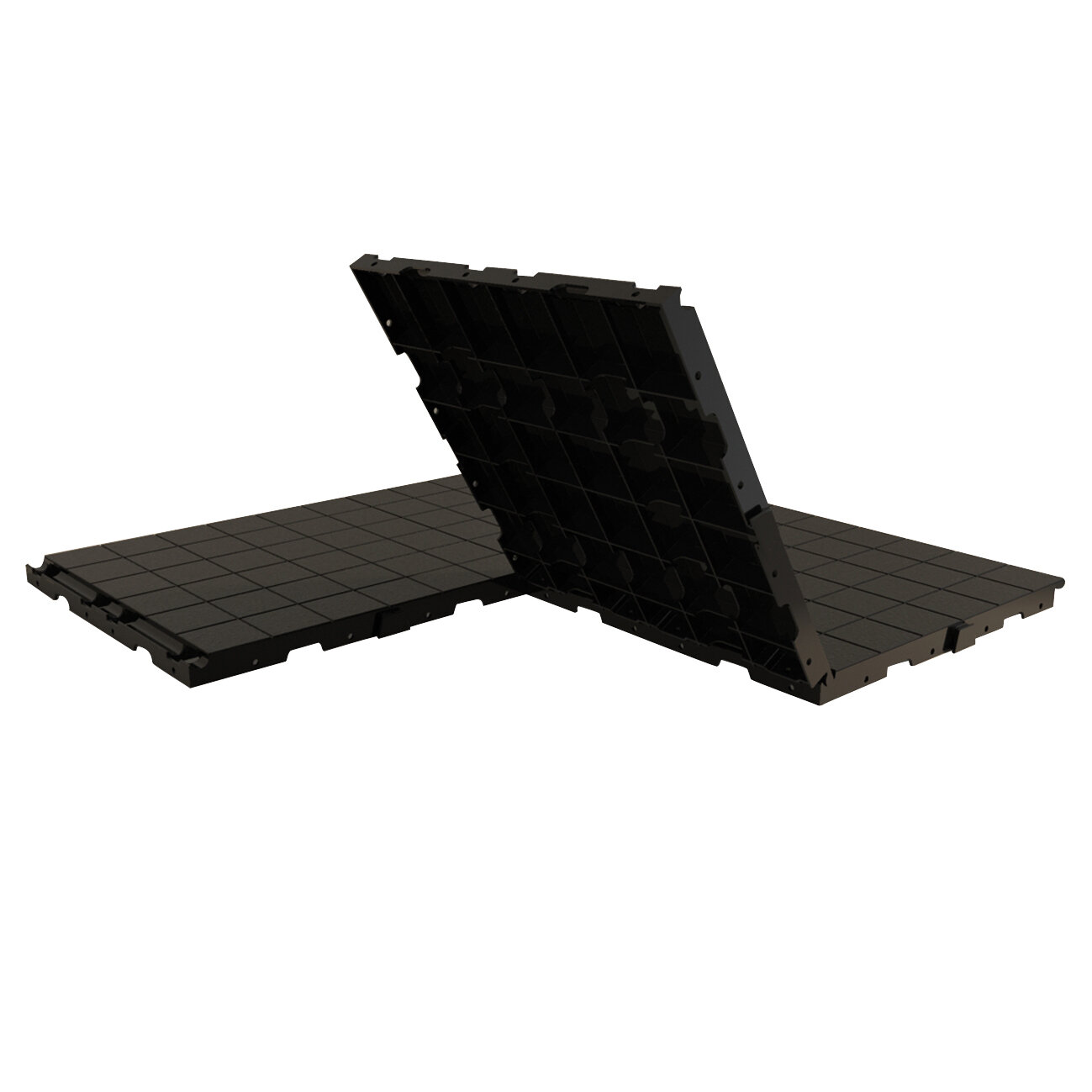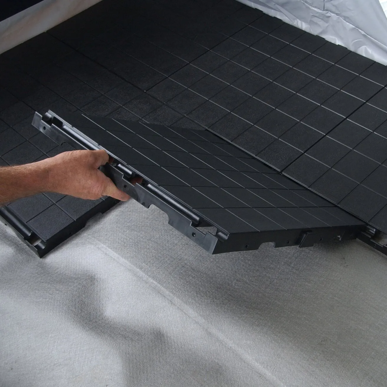 The IsabellaFloor offers numerous advantages. The honeycomb structure on the underside makes these panels very robust and they can be easily cut to any size without losing stability. Passages allow the installation of e.g. a power line under the panels. They are installed quickly and easily without tools, as the individual panels are simply slotted into each other like building blocks. To avoid tripping edges, you can purchase additional slanted pieces and corners. They not only look nice, but are also very convenient, e.g. for wheelchair users and families with prams.