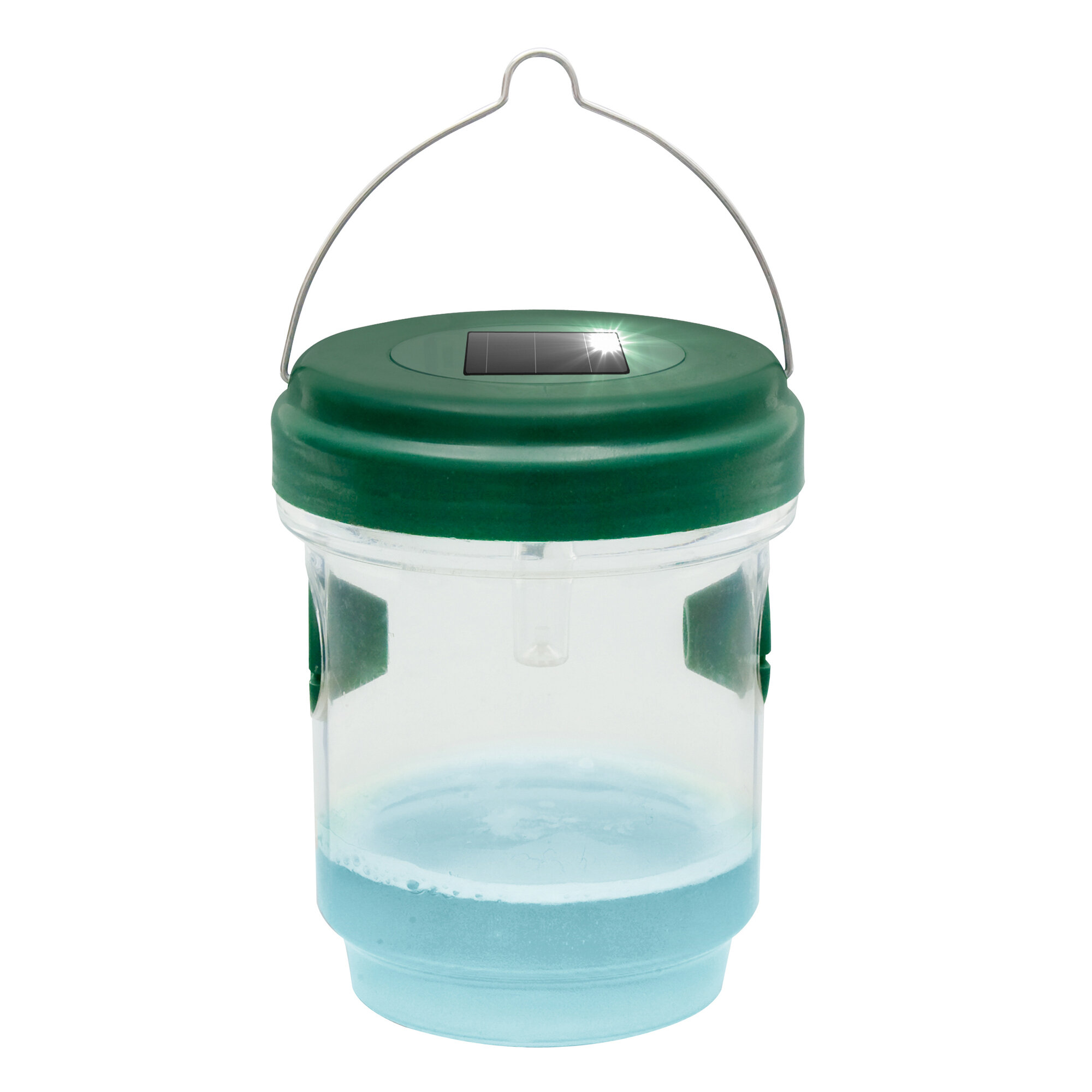 Fill the trap with a mixture of vinegar and sugar water to attract wasps. As soon as it gets darker, a blue LED light switches on and illuminates the liquid, which attracts insects.