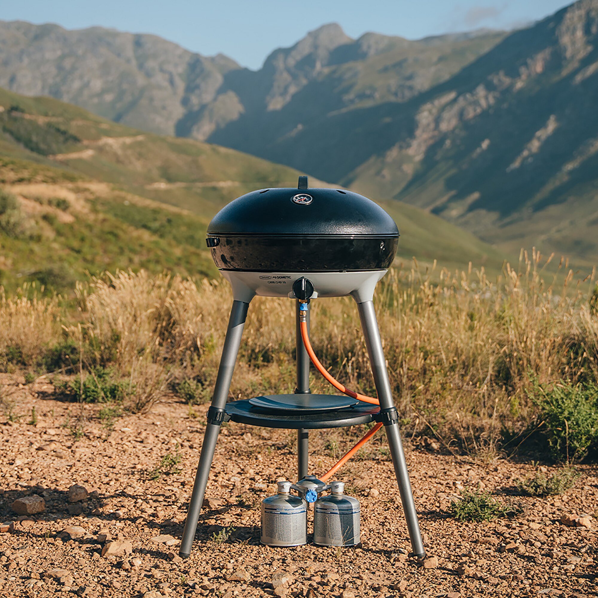 The all-in-one gas barbecue offers you a generous grilling surface with a diameter of 46 cm. With a powerful stainless steel burner and a piezo ignition, you can precisely set the temperature. The lid allows for oven use, ideal for baking or braising. A practical shelf provides additional storage space. The grill grate with CADAC GreenGrill ceramic coating ensures healthier and cleaner cooking. Thanks to a heat deflector, heat is distributed evenly. Cleaning is simple: remove the surfaces and clean them with CADAC Soft Soaks and soapy water. The barbecue is easy to assemble and can be stored in the supplied bags, making it ideal for home or holiday use. Additionally, the two-part legs offer flexibility, while the adjustable leg provides stability on uneven ground.