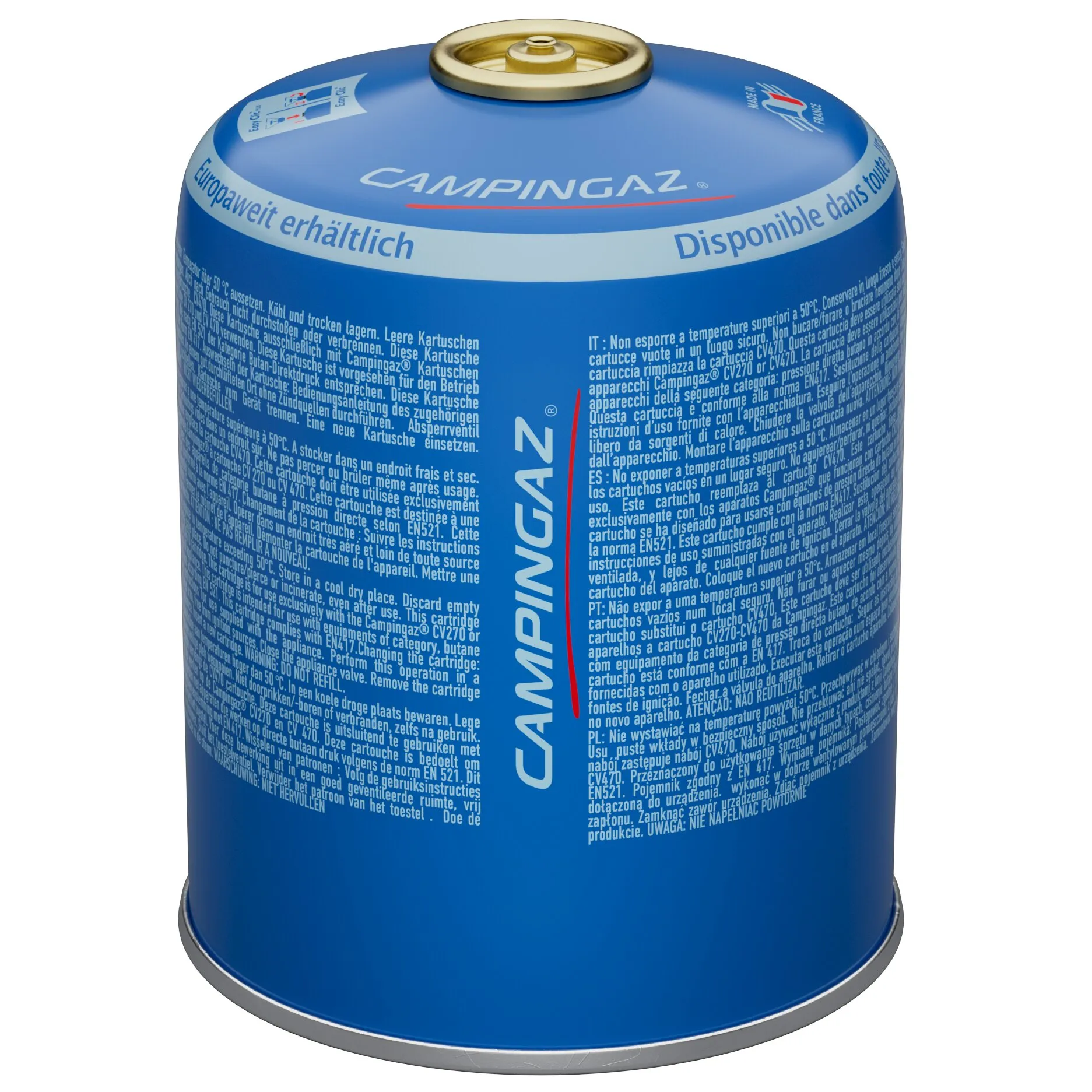 Valve cartridge with 450 g gas mixture 80/20 butane/propane. With Easy Clic Plus closure.