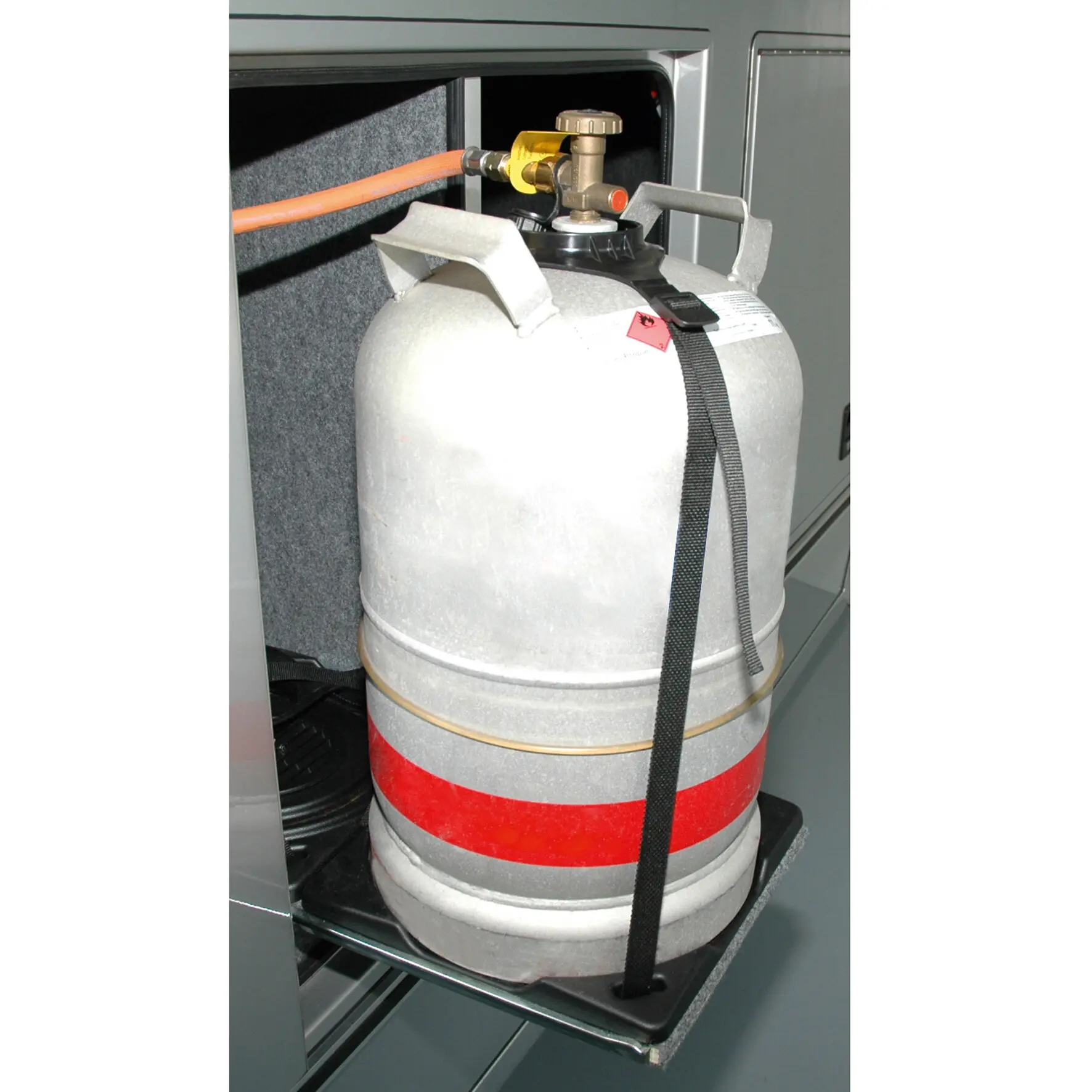 Holder for securely fixing the gas cylinder to the floor or to a base plate. Additional fastening to the side is not necessary. The gas cylinder is placed on the holder for 5 kg or 11 kg cylinders and fastened to the neck of the cylinder with a fastening strap.