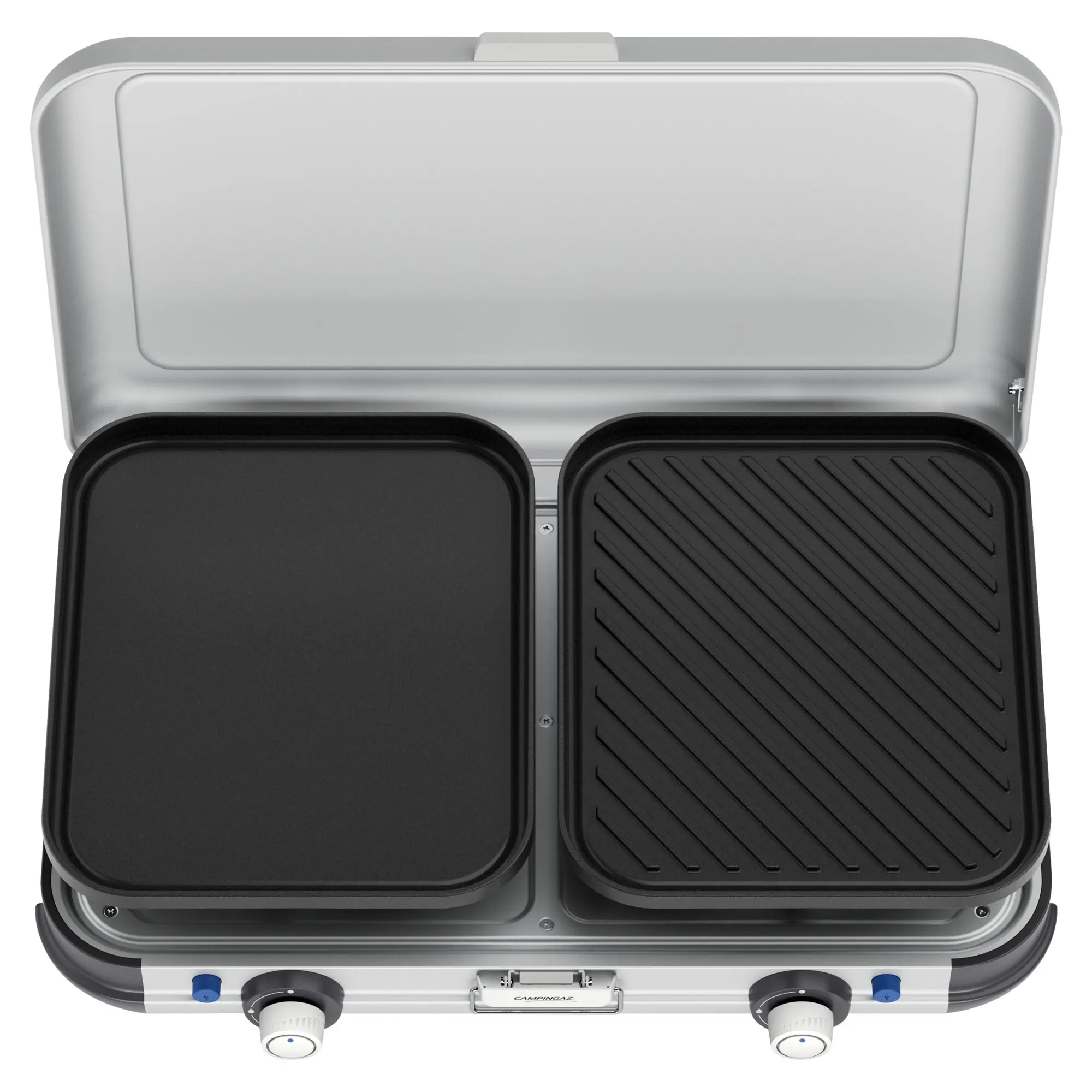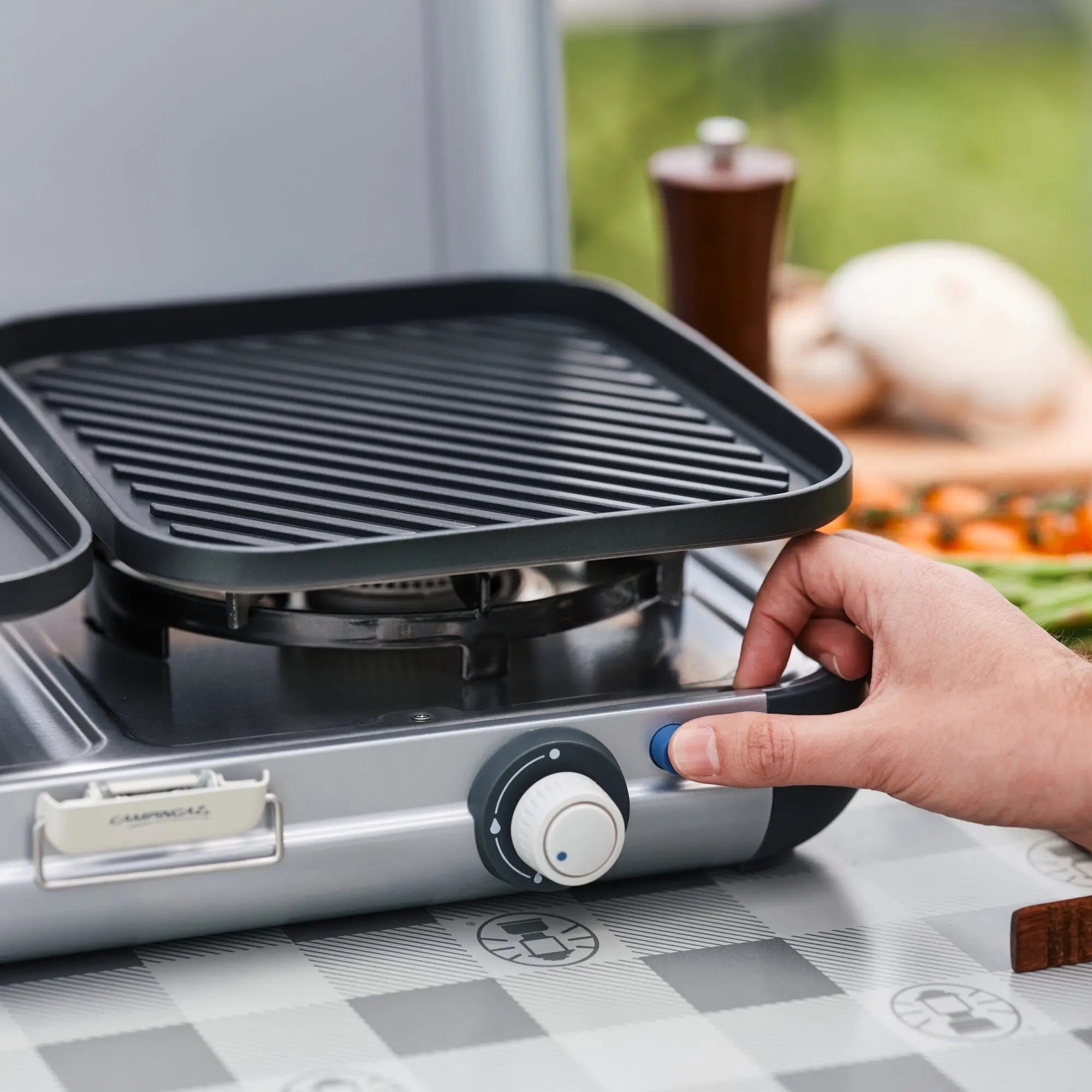 The Camping Kitchen™ 2 GRILL & GO is a versatile cooking and grilling companion with a 2-burner stove, removable grill grate and plancha plate. Ideal for outdoor adventures or social gatherings at home. Pan support ø 20 cm. Incl. transport bag.