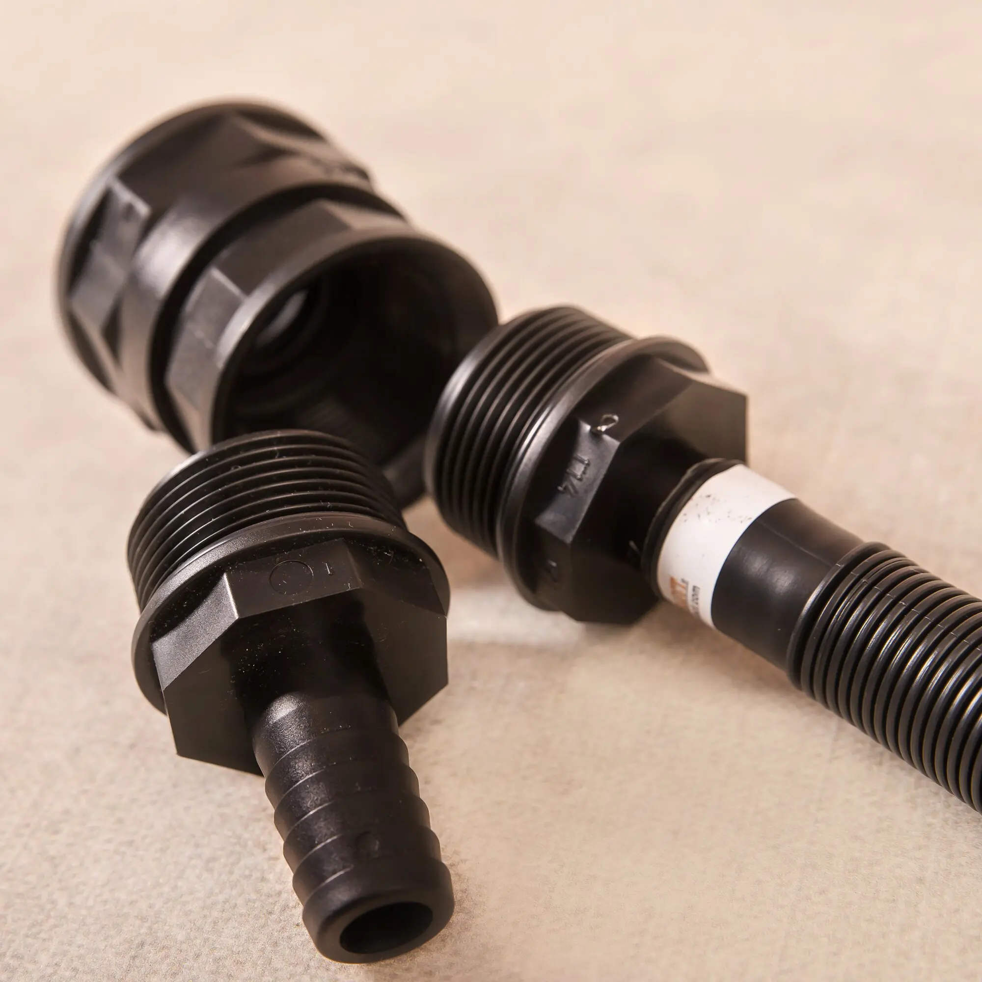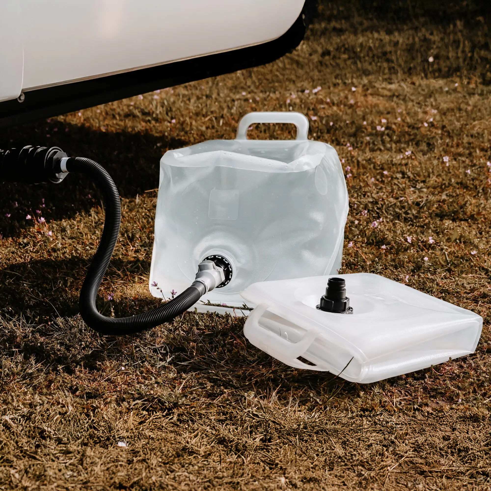 Set-Inhalt: Adapter, 50 cm Flexschlauch, Kupplung mit Ventil, 2 Ventilverschlüsse, 2 Faltkanister à 20 Liter, austauschbarer Schlauchanschluss für 20 mm Standardschläuche (Schlauch nicht enthalten)