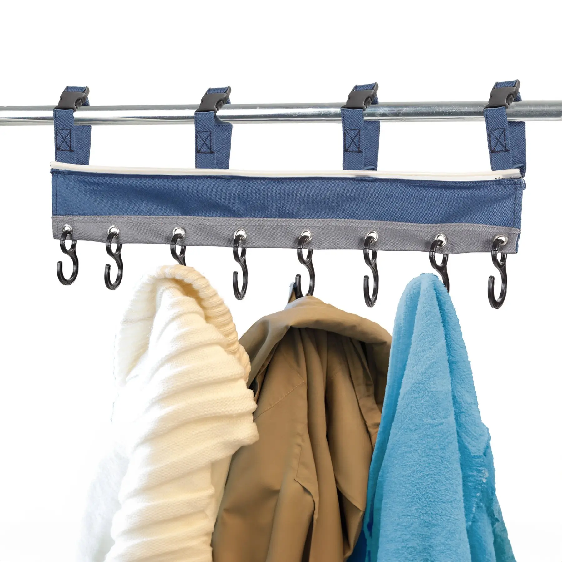 Hook rail with 8 hooks. Designed to be attached to tents and tent poles. However, it can be attached anywhere with fastening clips and also directly to the tent profile via its own piping (6 mm). Material: 100% polyester 600D.