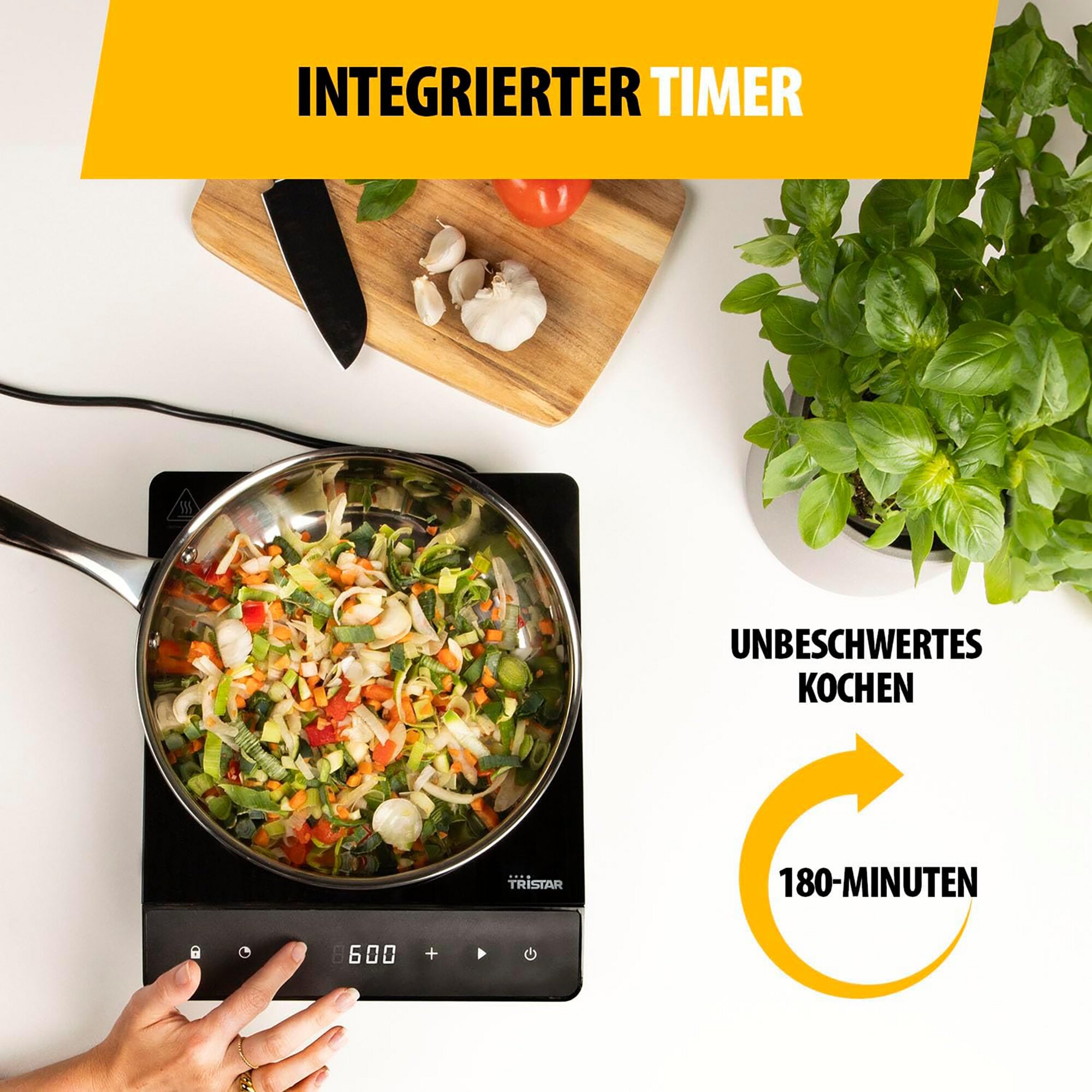 This induction hotplate impresses with 2000 W power and 10 power levels for precise cooking. Its safety features include automatic pot detection, automatic shut-off, overheating protection, a lock function and non-slip feet. You can control the temperature, power and the adjustable timer of up to 180 minutes via the LCD display and touch panel. Incl. black safety glass.