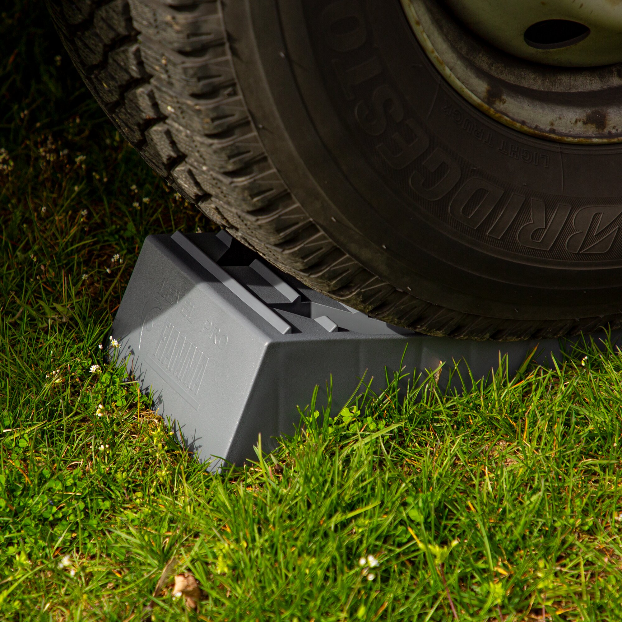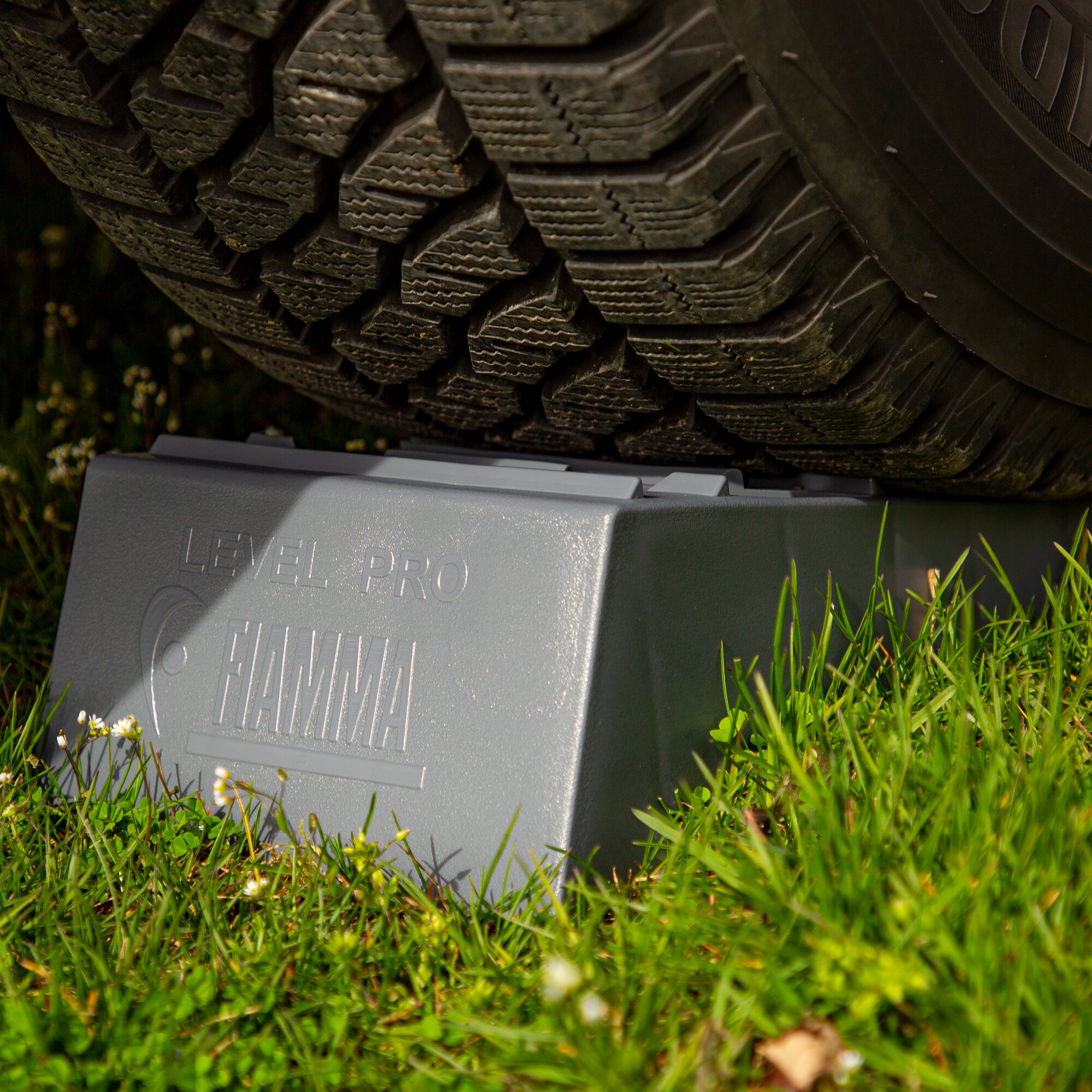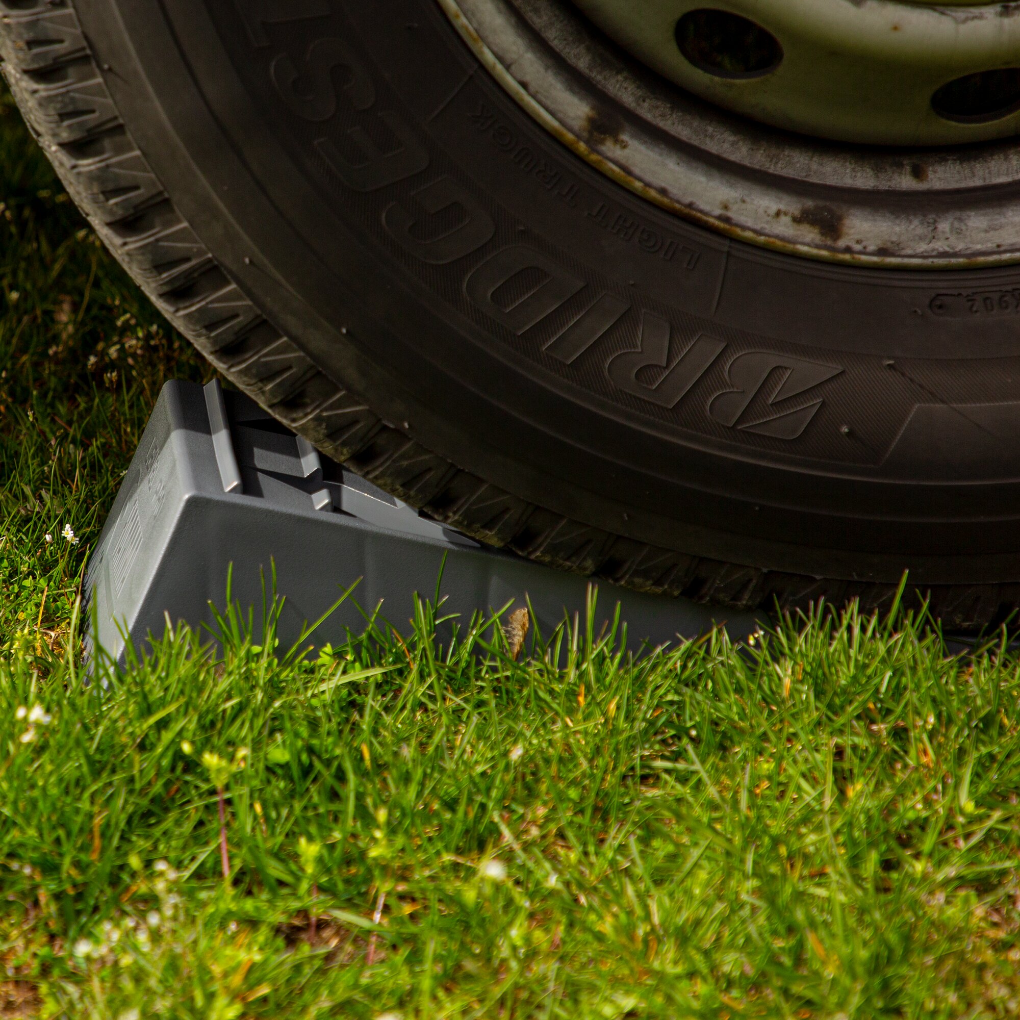 The compact levelling ramp, ideal for caravans and vans. Made of sturdy polyethylene HD, UV-resistant. Stacking system with self-locking latch. Anti-slip. Accessories (not included): Chock Level and Level Bag S.