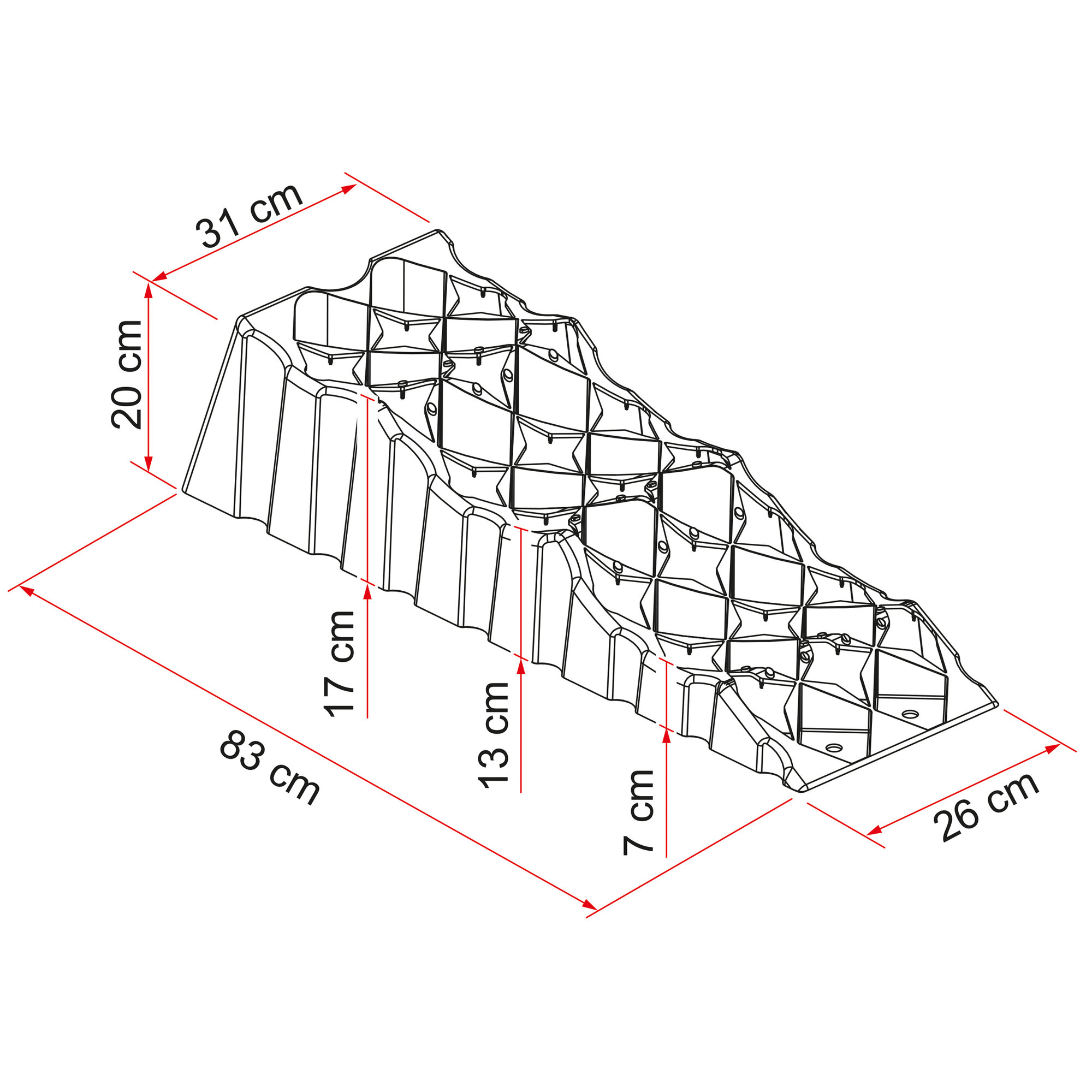 The heavy-duty step levelling system for all types of motorhomes, with three levelling steps with heights of 7, 13 and 17 cm. The new, improved design guarantees a high load capacity and adaptability on uneven grounds. Thanks to the convenient handle at the back, the level can be transported easily. Made of robust polyethylene HD, UV-resistant.