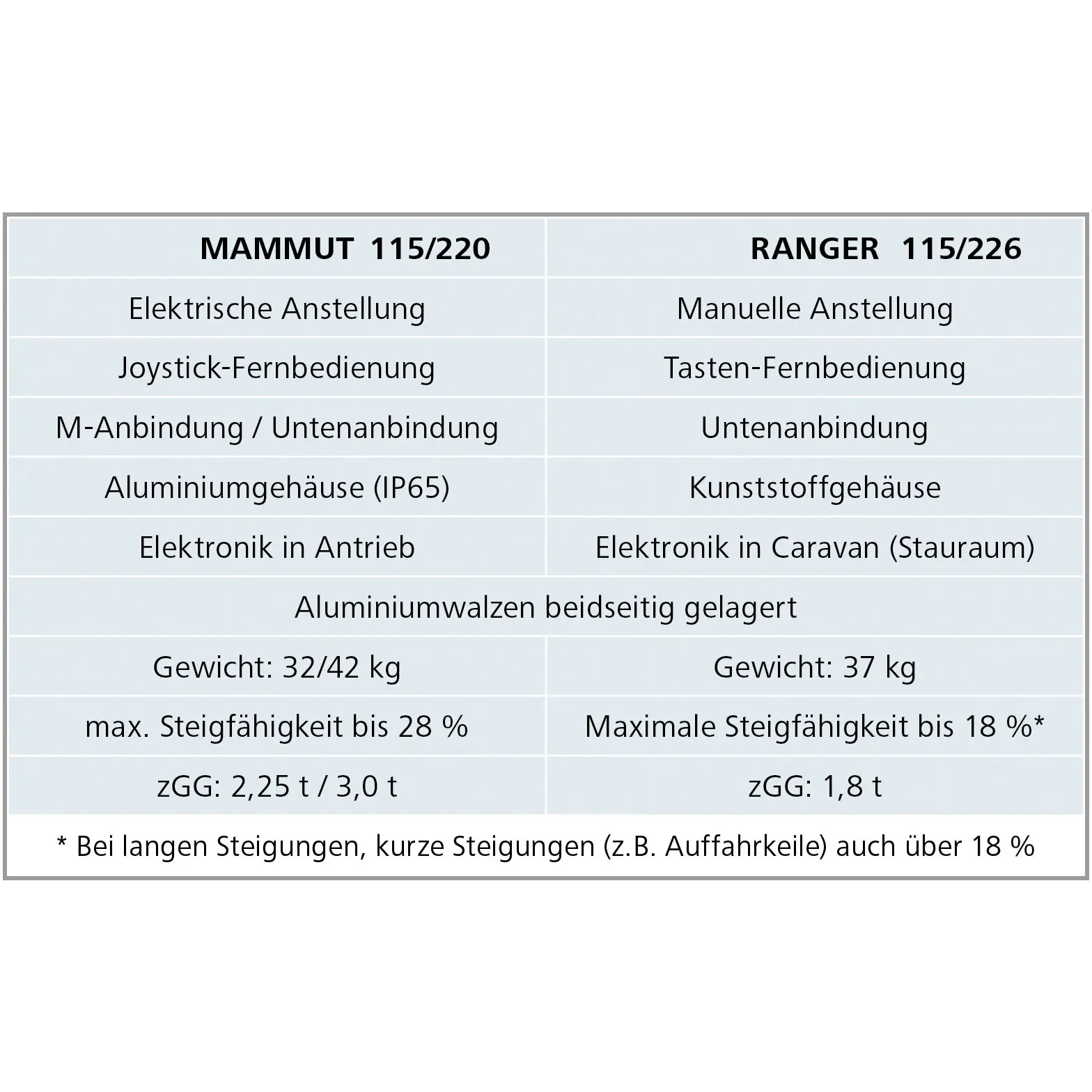 - Levelling capacity of up to 18% (long inclines)/more than 18% (short inclines, e.g. levelling ramps)