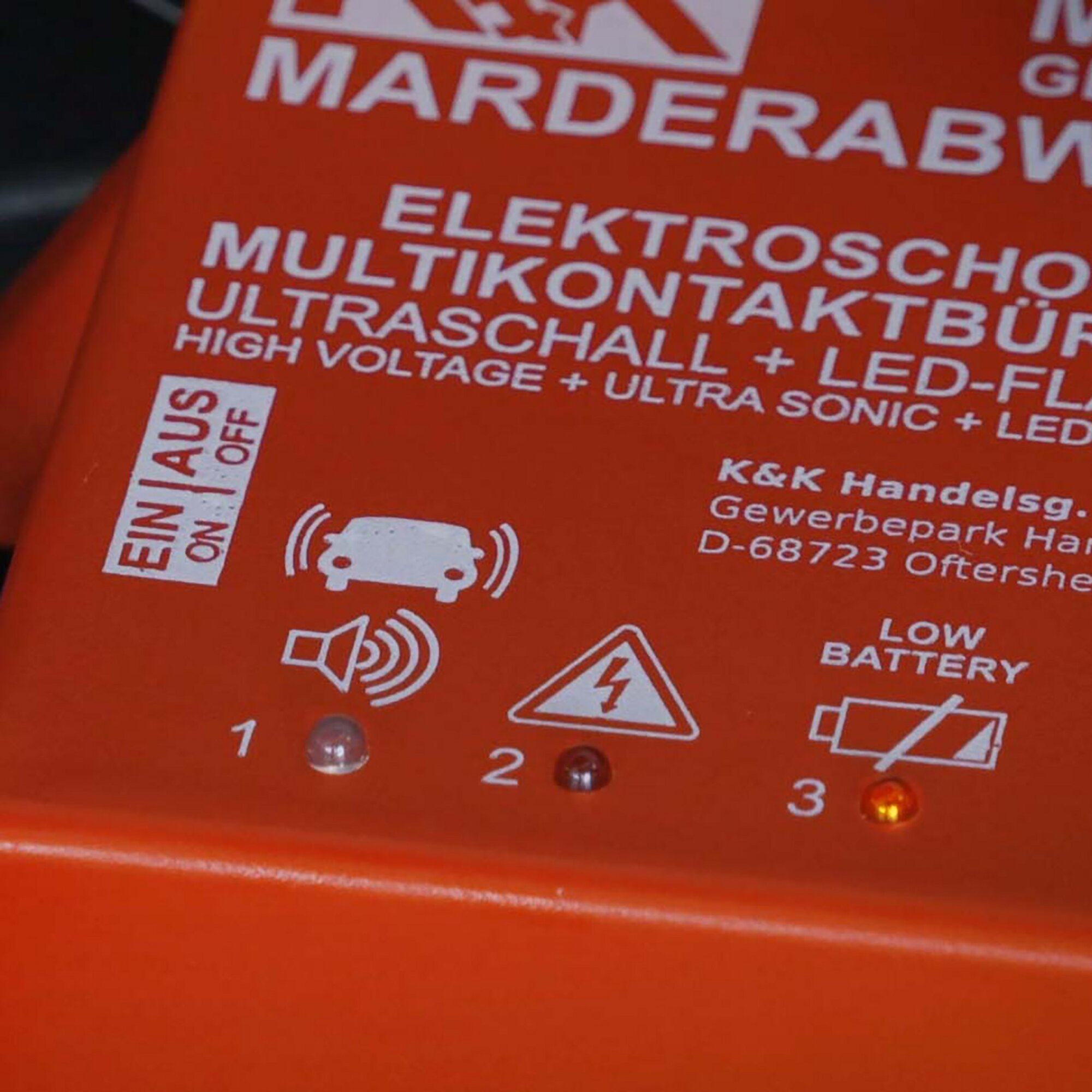 The waterproof high-voltage marten repellent does not rely on the on-board power supply as a source of energy, but is operated independently with AA batteries (4 x AA 1.5 V, not included in delivery) – without affecting the car battery. Thanks to the integrated low-battery indicator (LED), you will be informed in good time that the batteries are about to run out. The device effectively protects your vehicle as the 6 multi-contact high-voltage brushes can penetrate the martens' fur at any point. Self-extinguishing plastic, E1 mark of the German Federal Motor Transport Authority. Automatic on/off switch and waterproof compact plug for easy replacement. Extendable by 4 contacts. A safety bonnet switch is optionally available. Suitable for all motor generations. Dimensions basic device: 15.5 x 8.8 x 3.2 cm.
