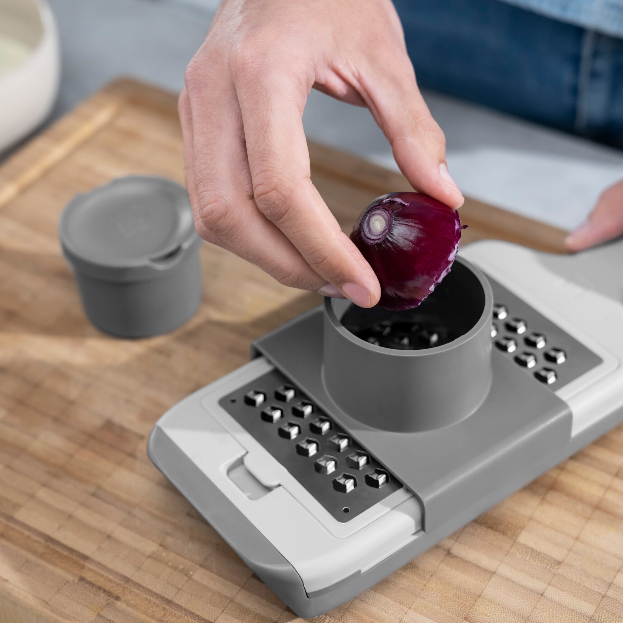 Multi-slicer, vegetable slicer and hand grater in one. With four interchangeable blades (fine grater, medium grater, coarse grater and cutter). With removable food attachment, collection container and integrated finger protection. Dishwasher-safe.