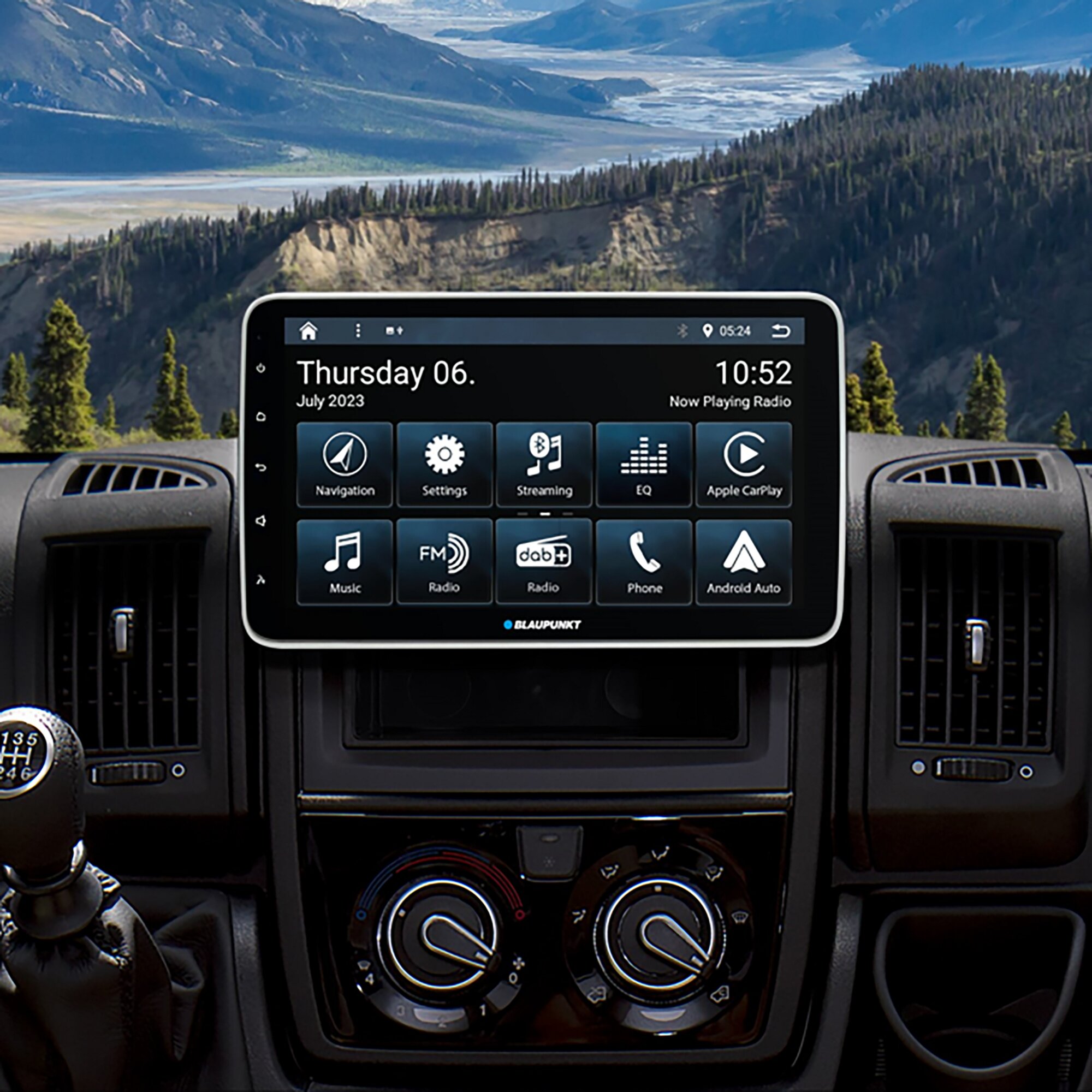 Construction form 1-DIN; IPS-HD panel; display size 10.1” (25.6 cm); media ports: 4 camera inputs, 3 channel-pre-amplifier output, A/V rear input, 3 x USB; resolution 1280 x 720 pixels; Bluetooth; DAB+ tuner; compatibility: Apple CarPlay wireless; Android Auto wireless; navigation integrated; software type: motorhome / caravan; navigation updates 3 years; output power 4 x 50 W; dimensions W 37 x H 28 x D 24 cm, weight 2.7 kg.