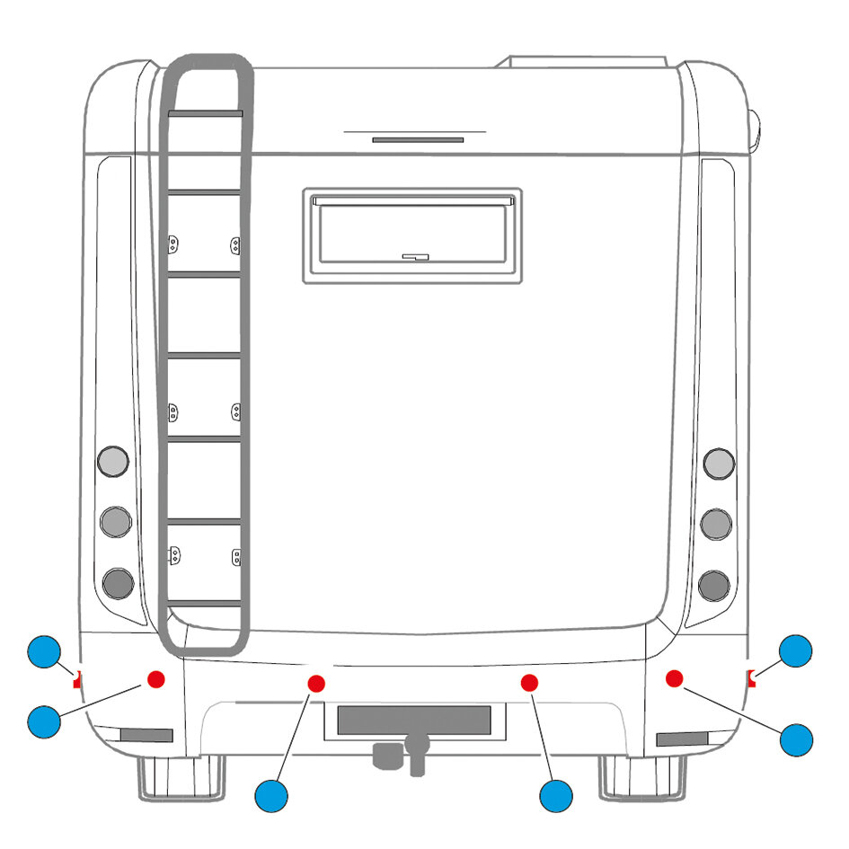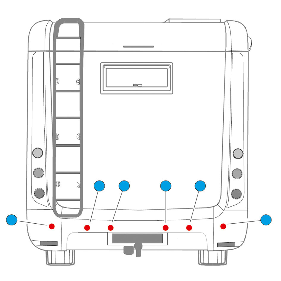 System with 6 compact digital sensors (ø 18 mm), which can be varnished in vehicle colour, ideally suitable for especially high or wide vehicles. With the measurement it considers also attachments to the bodywork, as for example bike carriers or towbars. If a bike carrier is attached, the system can be switched manually between 2 stop zones, depending on whether the carrier is folded in or out. The system warns acoustically within a detection range of approx. 3 m of obstacles, sensitivity is adjustable in 3 steps.