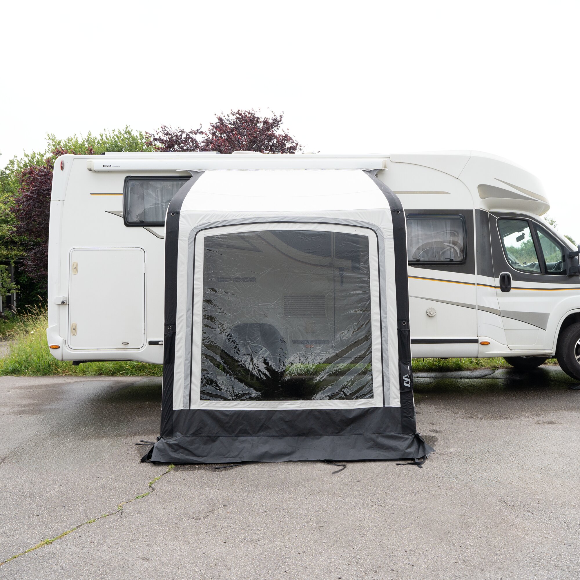 The inflatable awning Vega is perfect for those who travel a lot and change location often as it can be set up and taken down quickly. Thanks to the tent depth of 220 or 250 cm, the inside of the inflatable awning is very spacious. The air tubes are designed in such a way that you can stand upright and optimally use the space. The large panorama windows create a great sense of space. Thanks to the included mesh element, it is perfect for warm weather, because it provides shade, insects stay outside and you can enjoy a pleasant temperature inside the tent. This model is additionally equipped with a connection for the sun canopy Canopy Shady Pro.