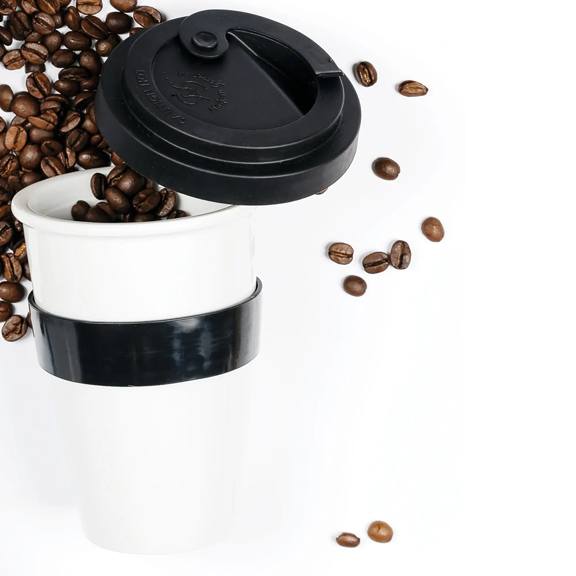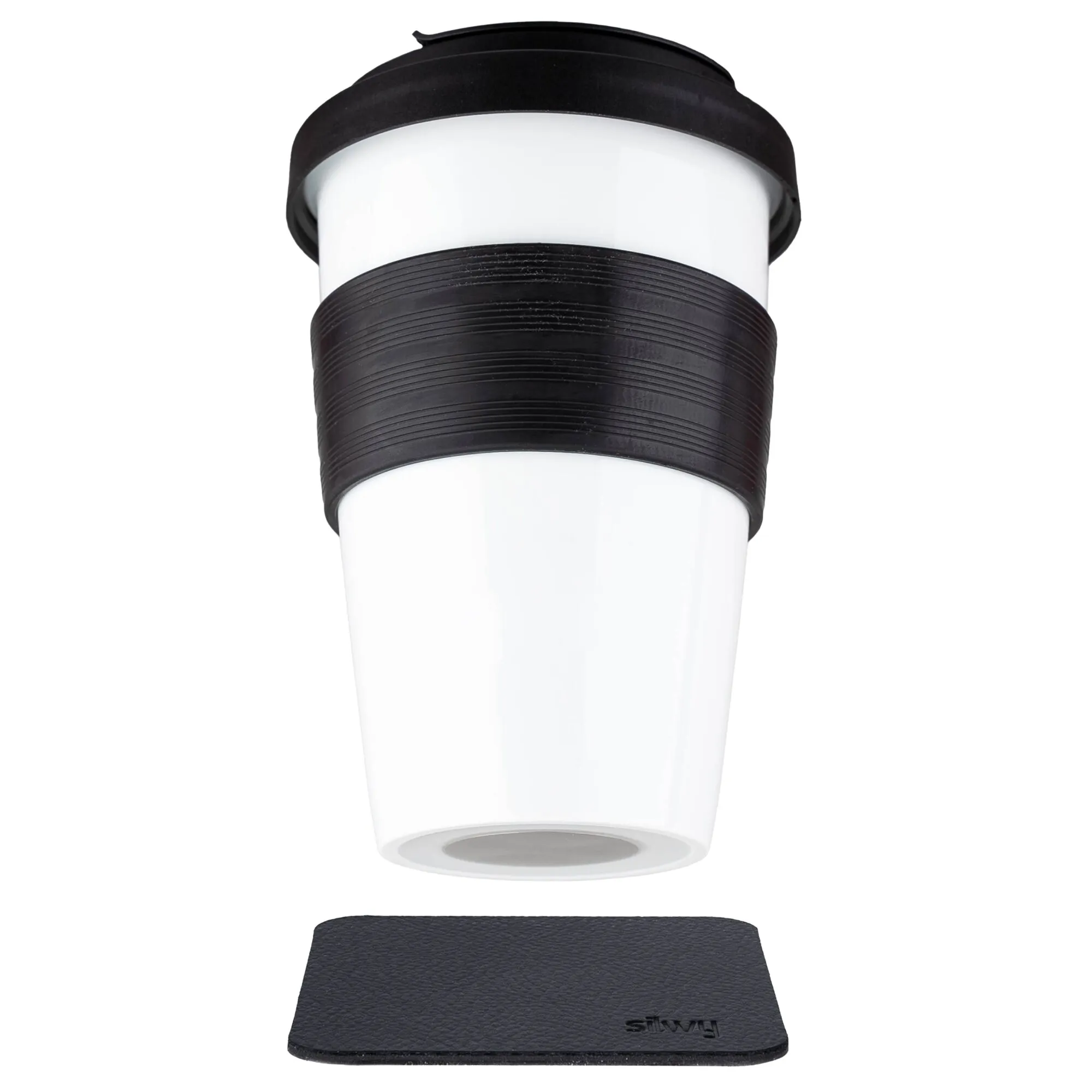The coffee mug is equipped with a perfectly integrated magnet. The set consists of a porcelain coffee mug, a metal nano gel pad and a lid.