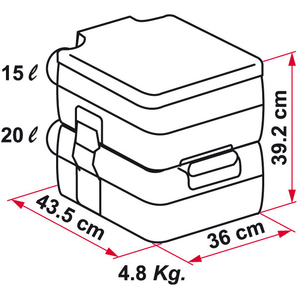The portable toilet is easy to use and equipped with an external vent valve and a robust one-piece base. The waste tank is removable and the convenient hand pump has a large flush volume. The toilet is easy to lock with stainless steel hooks.
