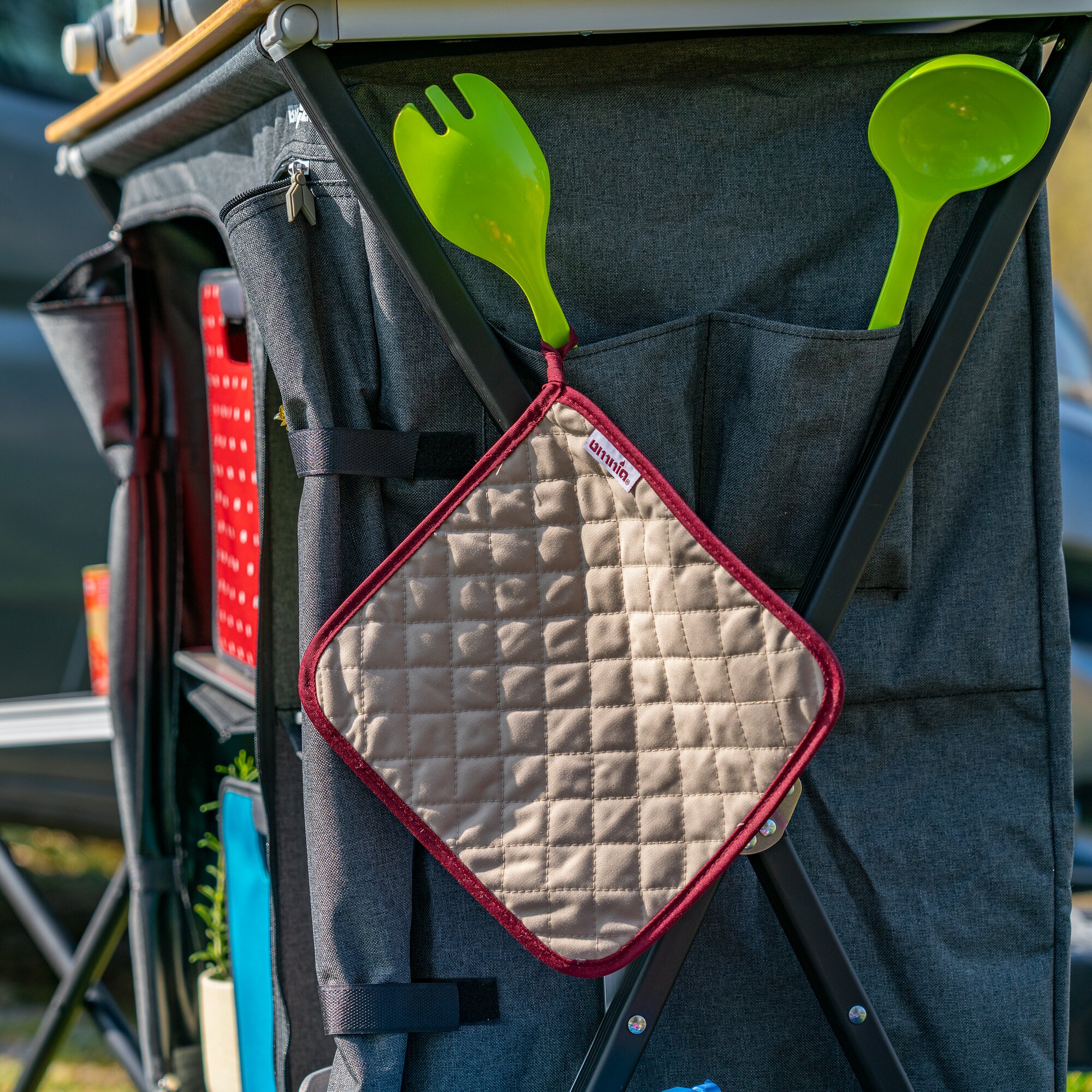 The stylish pot holders in beige with a wine red rim make it easier to grasp the Omnia lid and baking dish. Important: Do not touch the hot stainless steel base with the pot holders!