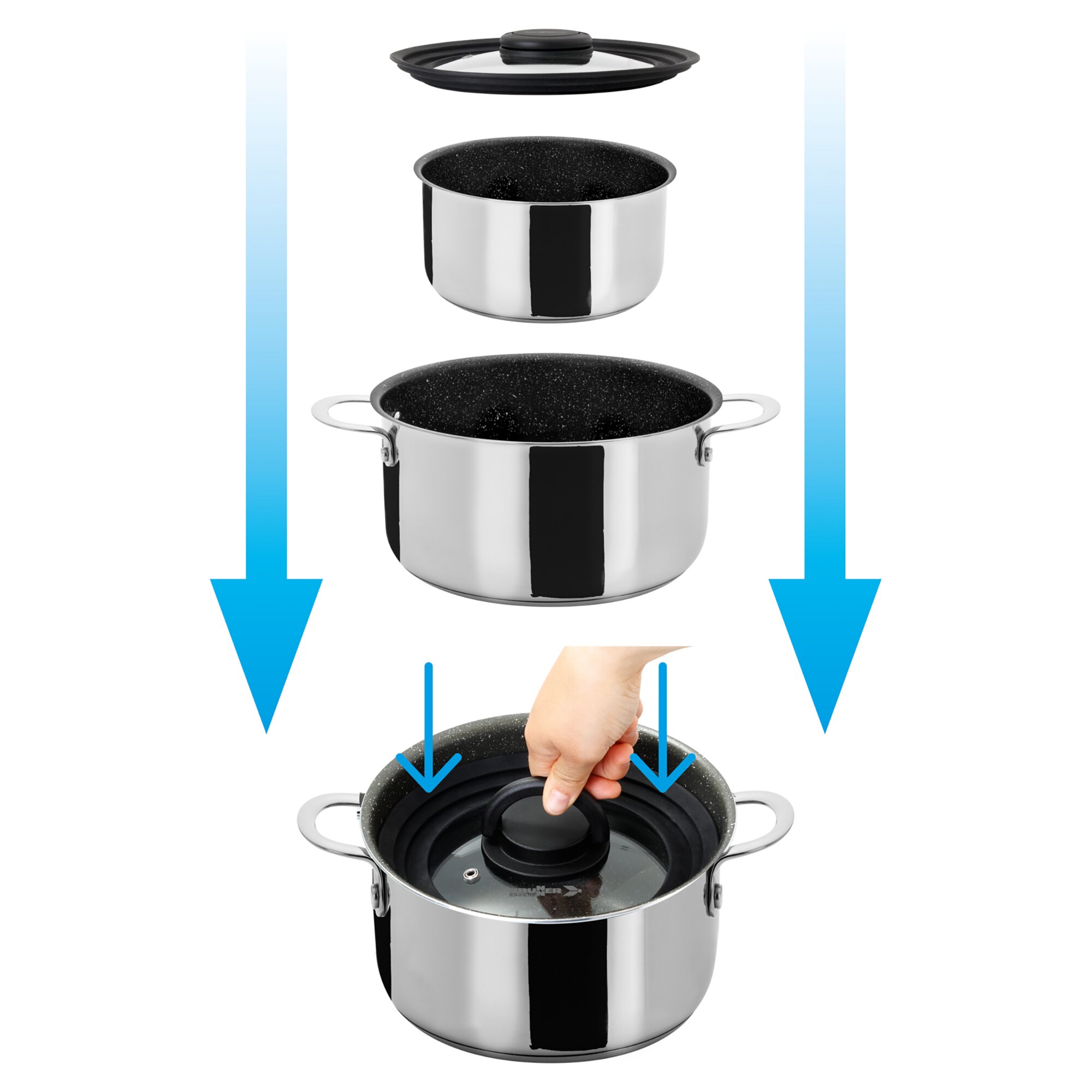 High-quality stainless steel pot collection with non-stick coating. Space-saving design. Particularly suitable for recreational vehicles and boats. The large pot and the pan are equipped with sturdy handles and a thermal base. They are suitable for gas, electric, ceramic and induction hobs. Dishwasher-safe. With Vacublock system.