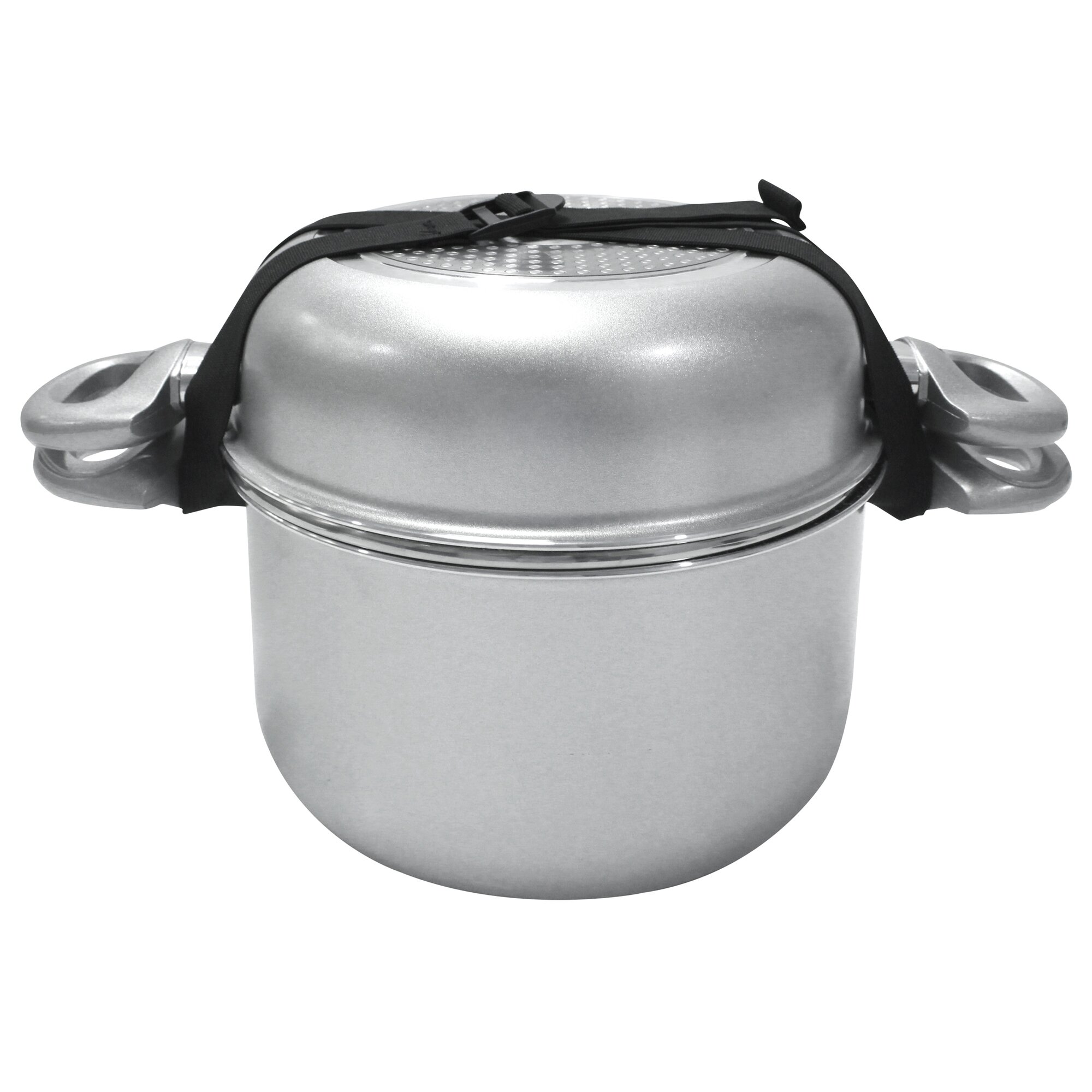 High-quality aluminium pot set with non-stick coating and induction. The detachable handle is equipped with a security lock to prevent unintentional opening.
