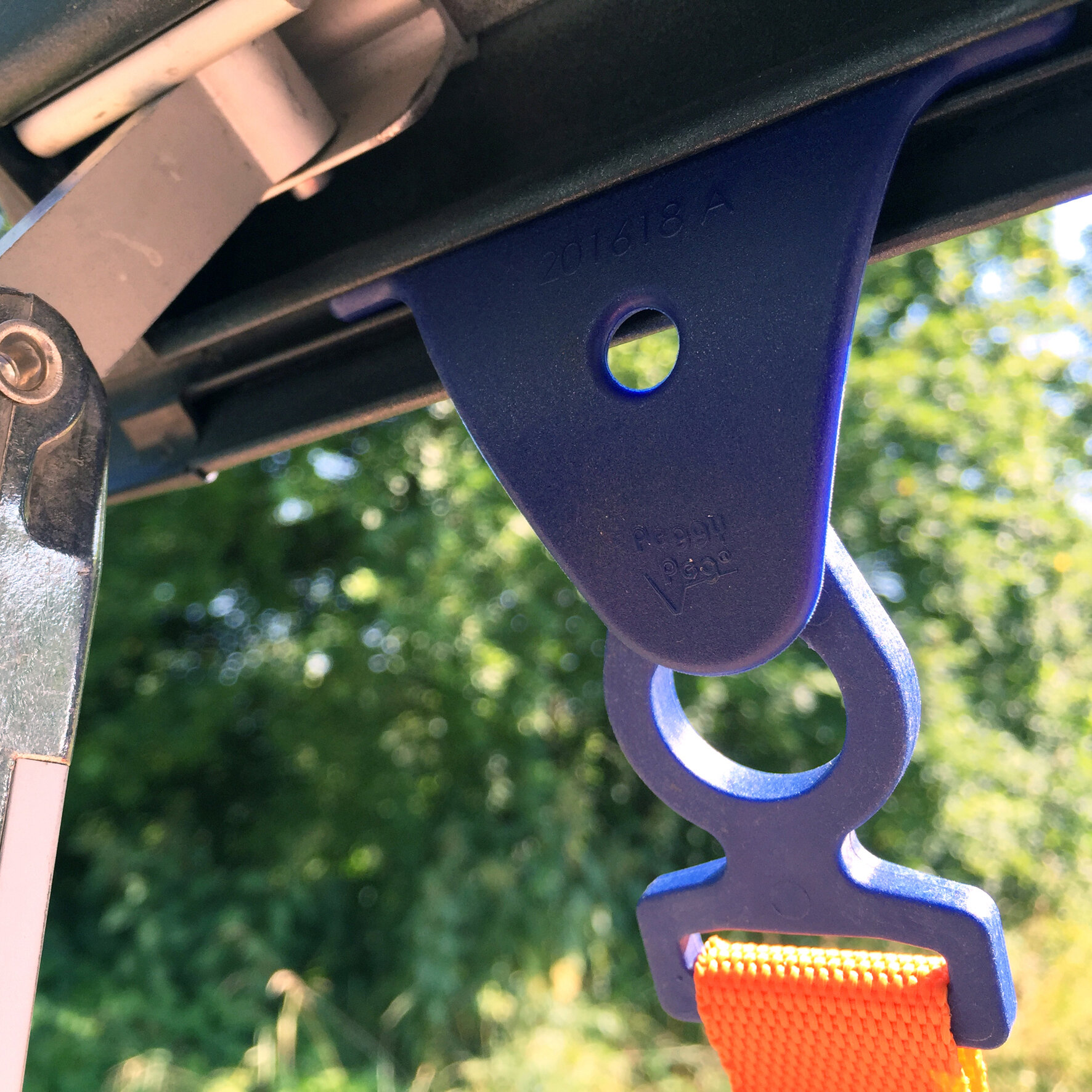For additional tensioning of awnings, bag awnings and tents in bad, windy weather to support the awning extension arms. Is attached to the awning by means of the supplied T-connector in the piping rail or hooked directly onto the tent pin and tensioned to the ground. The system is closed and cannot get loose by itself. It is nonetheless easy to dismantle by unhooking the T-connector in the eyelet.