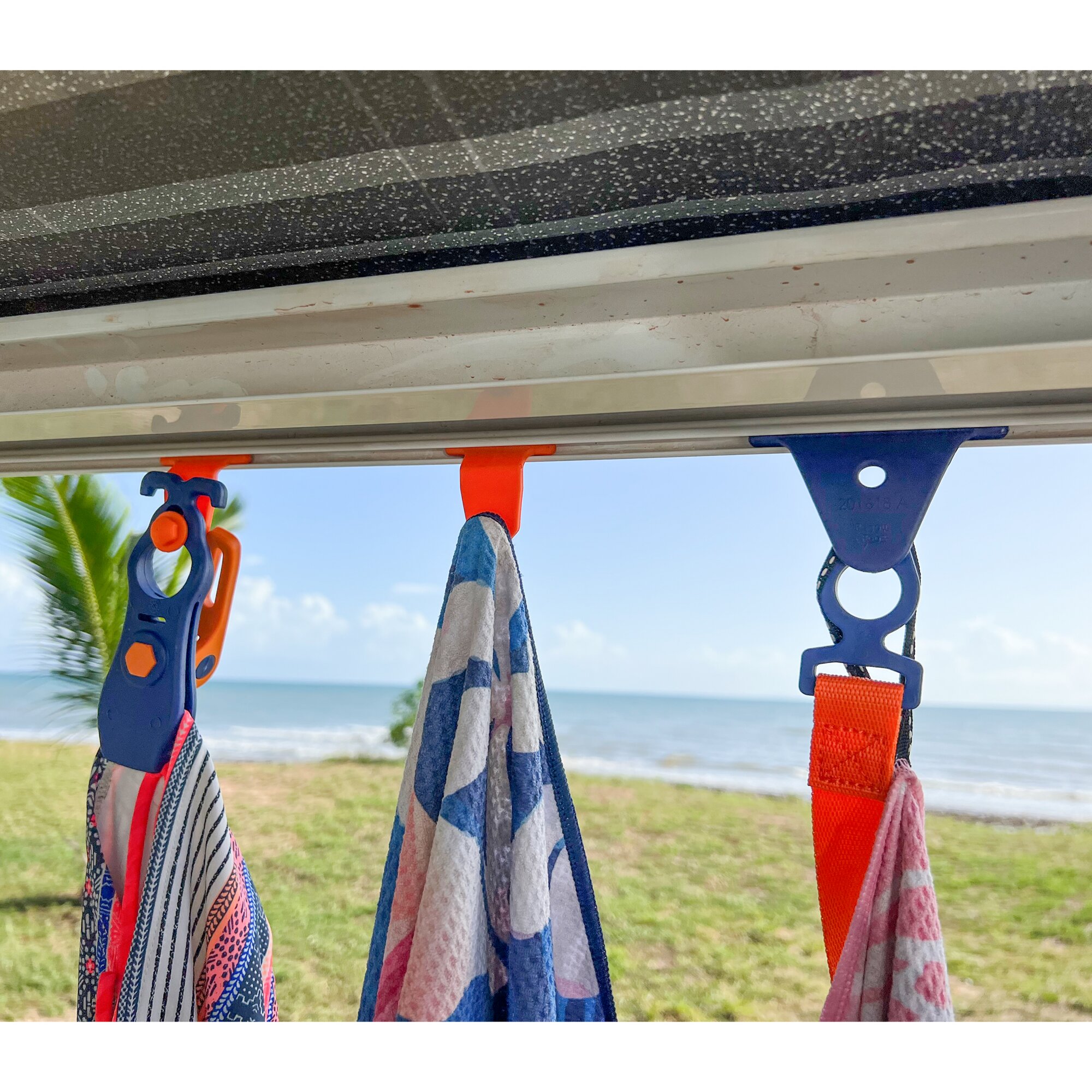 Can be inserted into both awning and caravan piping rails. Together with the Crocodile Peggy, a universal tensioning strap can be attached and shading can be quickly generated using cloths. When inserted into the piping, it can also serve as a (dish) towel holder.