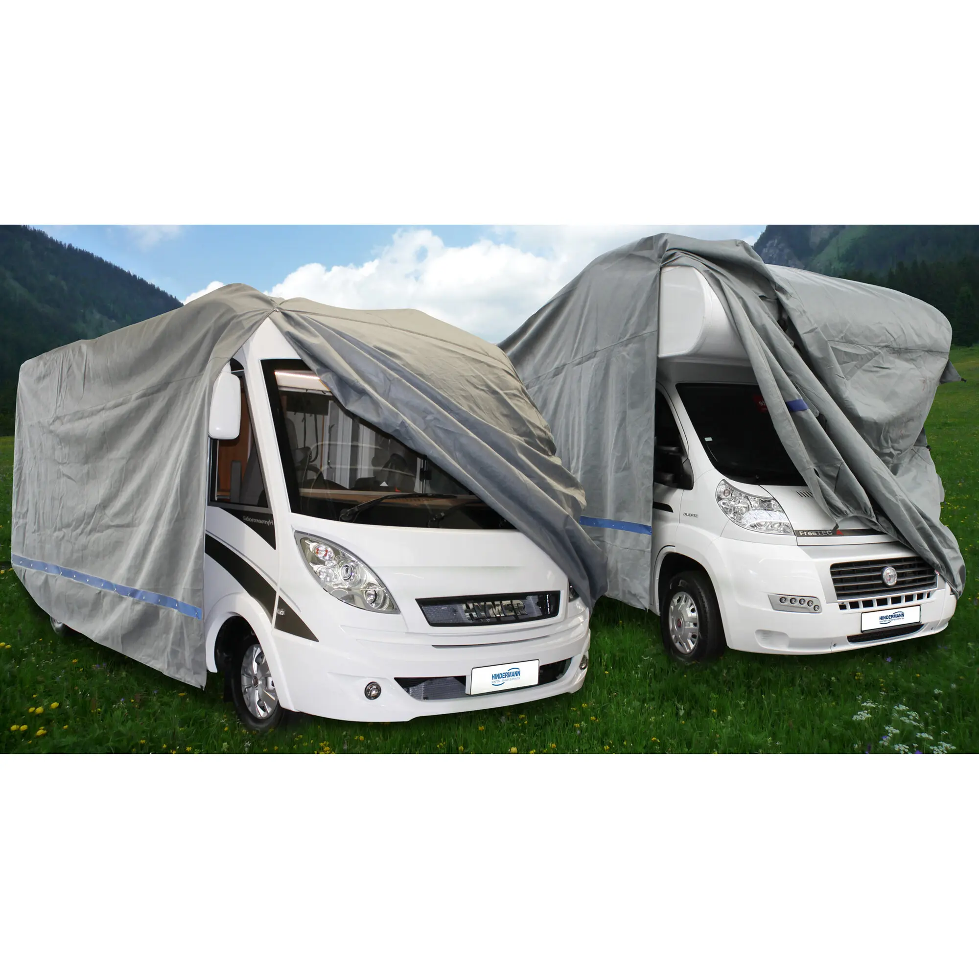 All-around breathable covers, which protect the vehicle from negative influences, such as rain, dirt, ice, heat or soiling caused by birds and trees. Humidity can easily evaporate via the lateral areas. The covers made of a 3-layered SFS-3 Nonwoven material (160 g/m²) are characterised by their high tear-resistance and low weight. All versions are equipped with 4 zips, which facilitate handling and enable an access to the entrance door and the storage box. Moreover, they are equipped with an eyelet strip on both sides and clamping straps at the front and back side. To find the right size, find the biggest girth, including, for example, bike carriers and all overhangs. Included in delivery are a tensioning system which is adapted specifically to each girth, a repair kit as well as a transport and storage sack.