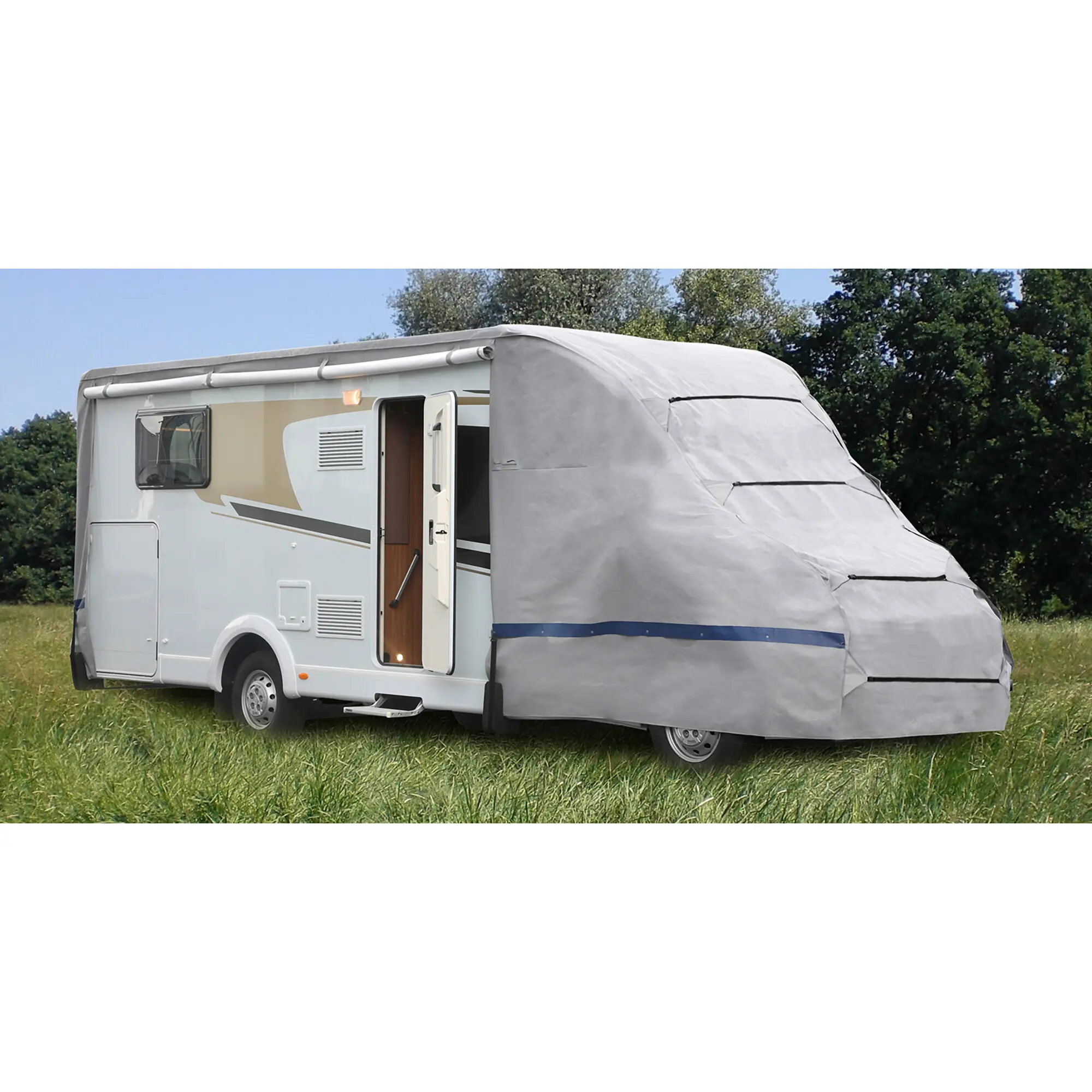 All-around breathable covers, which protect the vehicle from negative influences, such as rain, dirt, ice, heat or soiling caused by birds and trees. Humidity can easily evaporate via the lateral areas. The covers made of a 3-layered SFS-3 Nonwoven material (160 g/m²) are characterised by their high tear-resistance and low weight. All versions are equipped with 4 zips, which facilitate handling and enable an access to the entrance door and the storage box. Moreover, they are equipped with an eyelet strip on both sides and clamping straps at the front and back side. To find the right size, find the biggest girth, including, for example, bike carriers and all overhangs. Included in delivery are a tensioning system which is adapted specifically to each girth, a repair kit as well as a transport and storage sack. Size determination To choose the correct size, the largest circumference of the vehicle (girth= 2 x length + 2 x width) is measured. In doing so, all overhangs, such as bike carries, have to be taken into account. Subject to minor dimensional tolerances. The height of the hood is always approximately 35 cm lower than the overall vehicle height.