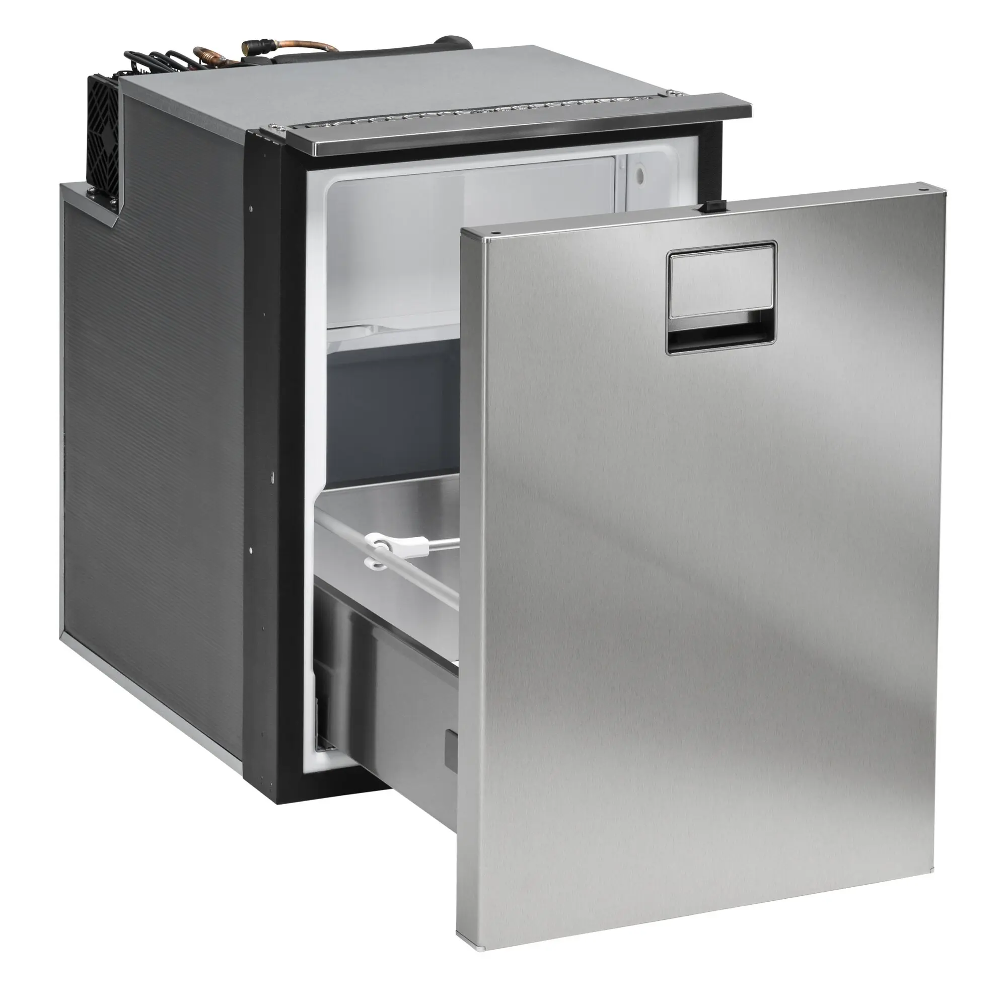 The compressor refrigerators in the Cruise Drawer series with pull-out drawers have been developed for flexible use in vans and small motorhomes as well as for unconventional installation solutions on board. Thanks to the special mechanism with highly resistant stainless steel guides and roller bearings of the drawer, the refrigerator can be easily opened and closed in no time. The interior can be used flexibly to store different refrigerated goods thanks to the sturdy drawer, sliding compartments, bottle holders, adjustable rails and the freezer compartment. The DR65, DR85 and DR130 models are also equipped with sliding shelves, bottle holders and adjustable rails.