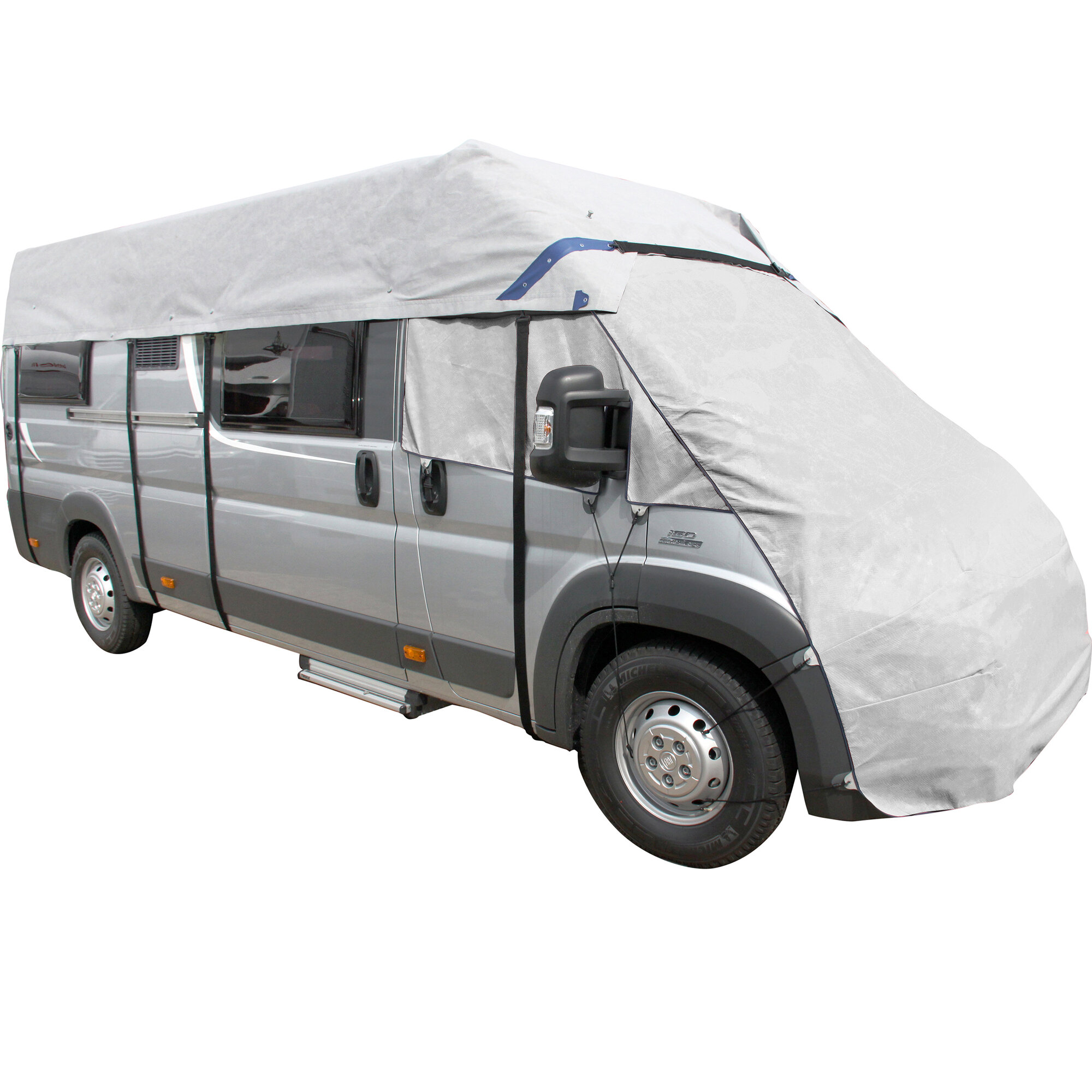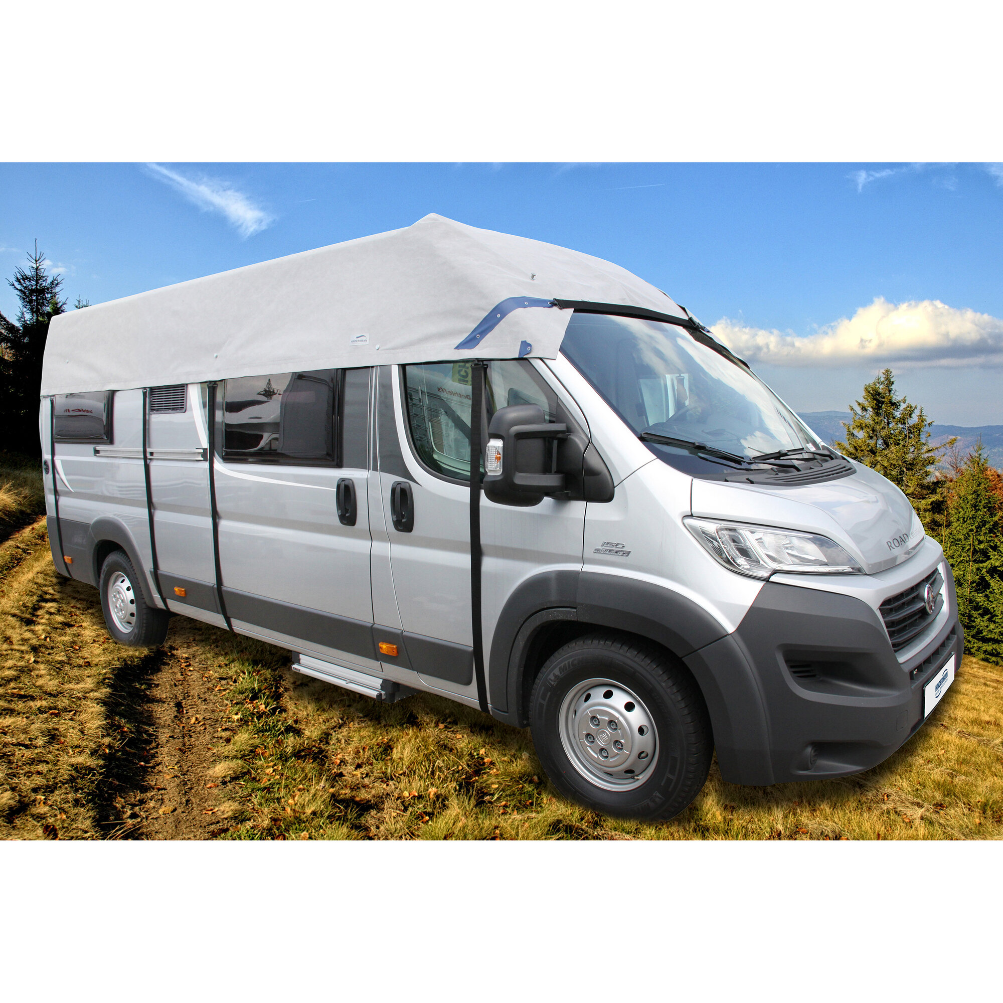The roof protection tarpaulin can also be perfectly combined with the motorhome front protection tarpaulin made from the same Tyvek Supra FC material. In addition to the roof, the front of the vehicle is also optimally protected against icing, snow and sunlight (item no. 85 663, catalogue page 343).
