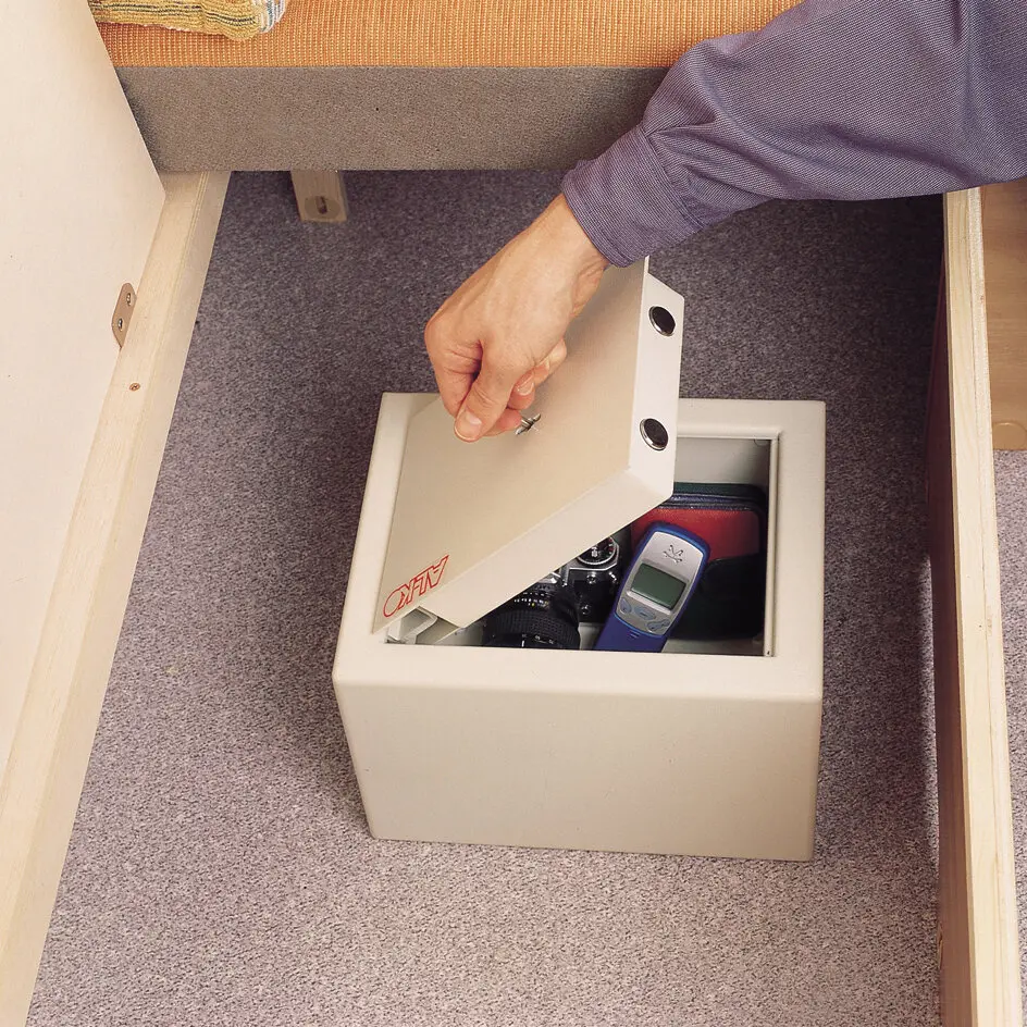 Your belongings are very safe behind solid steel walls. Only the double-bit safety key opens the sturdy round bolts of the safe door. Independent of electricity and battery, the safe stays in the caravan, firmly anchored by a mounting plate on the vehicle floor.