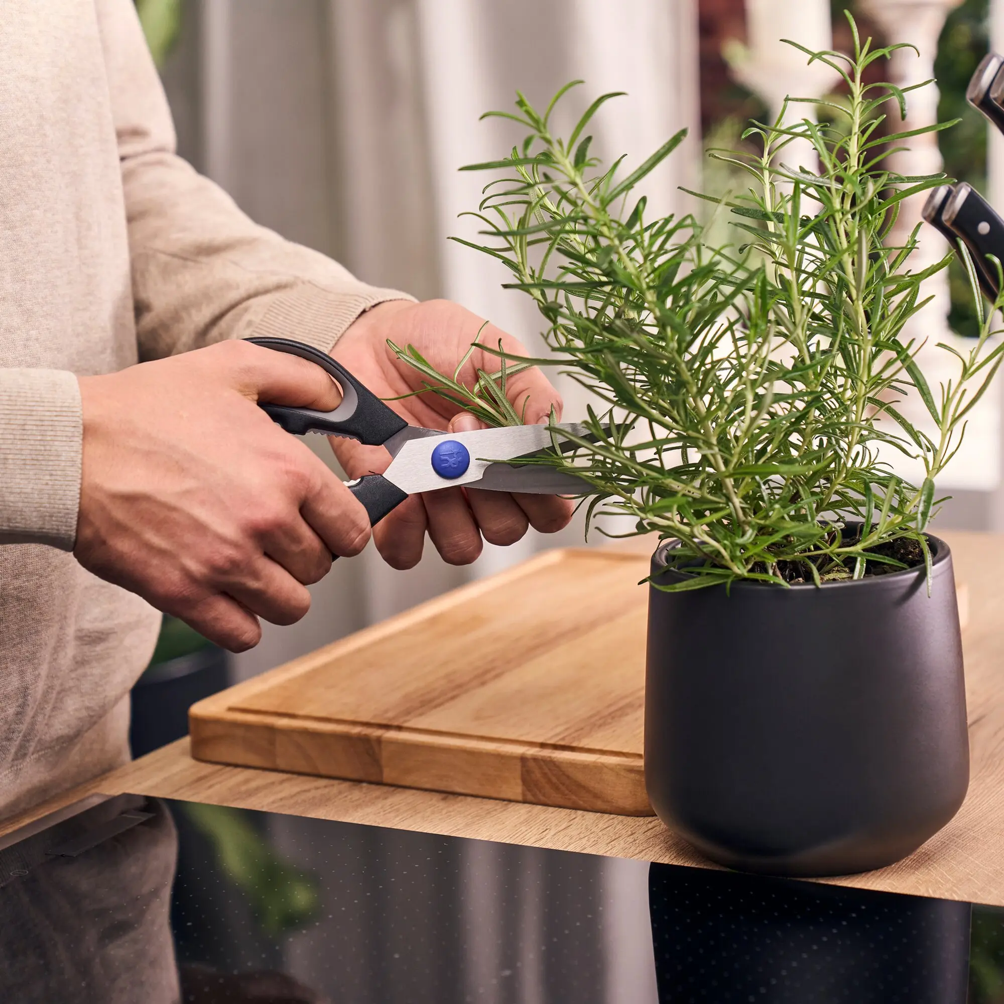 Scissors made of special stainless steel with a plastic handle, two smooth blades and a screw cap opener.