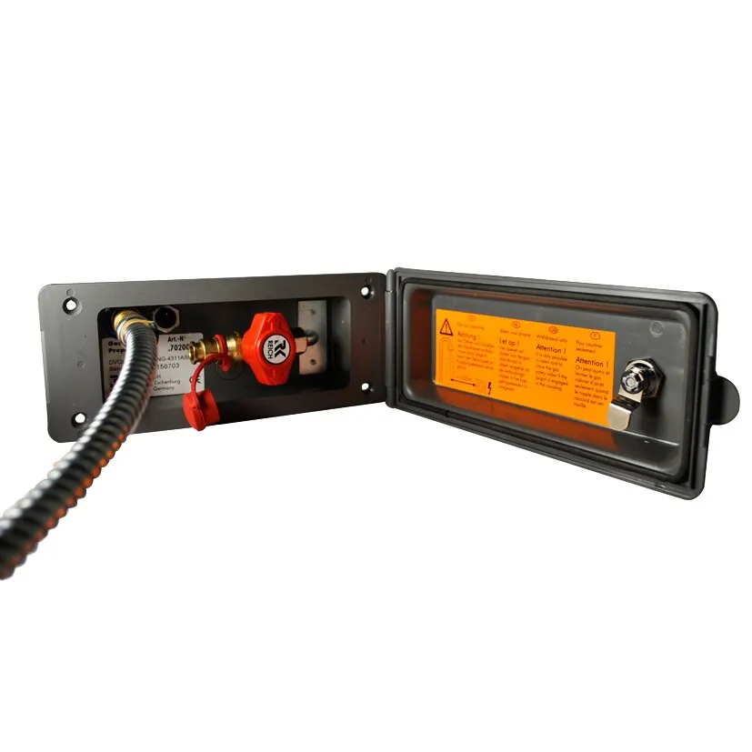 With one outlet each for gas and water supply outdoors. After removing the respective hose (gas hose and shower not included), the water supply will automatically stop. Equipped with gas shut-off valve. With lock and key. Installation dimensions: 157 x 67 mm.