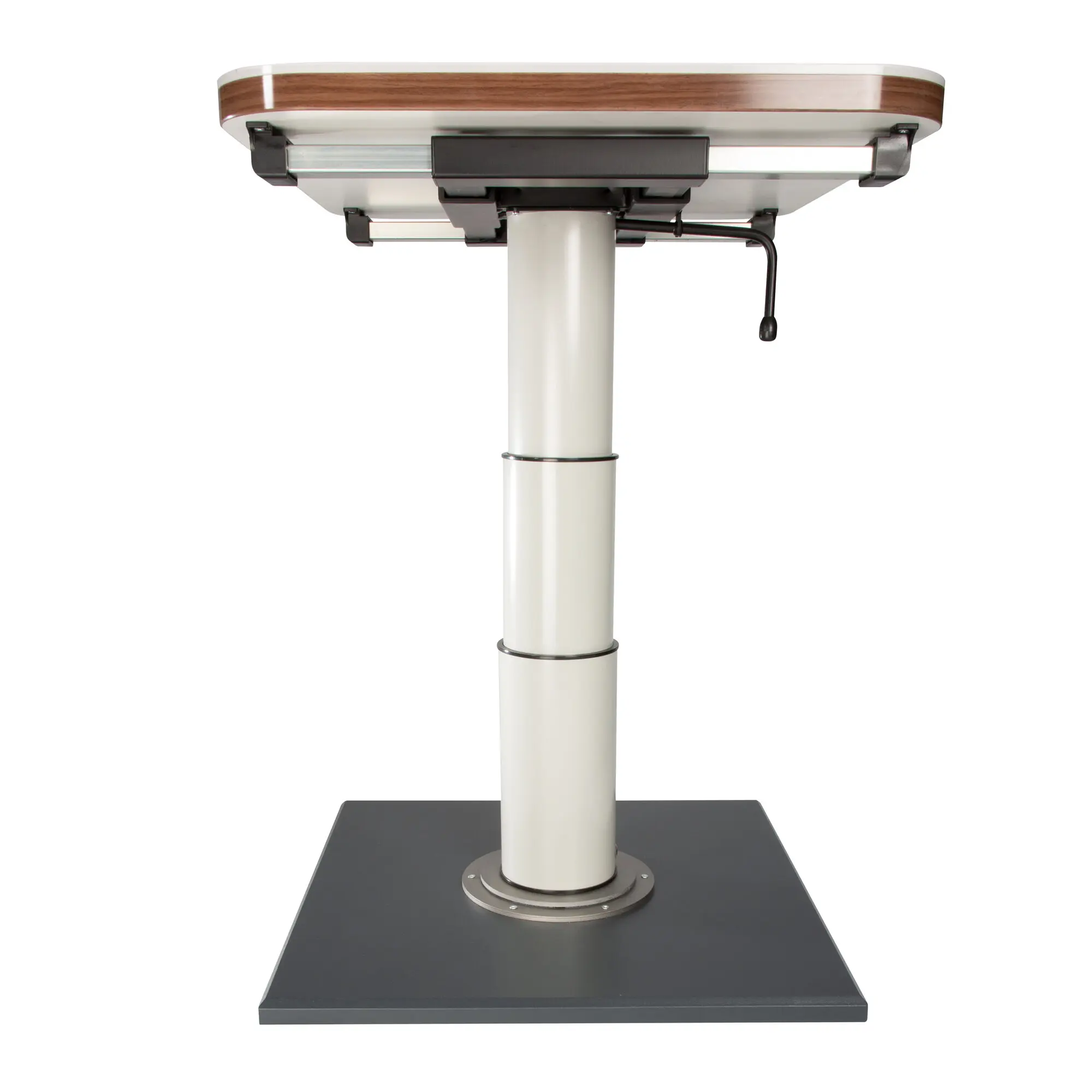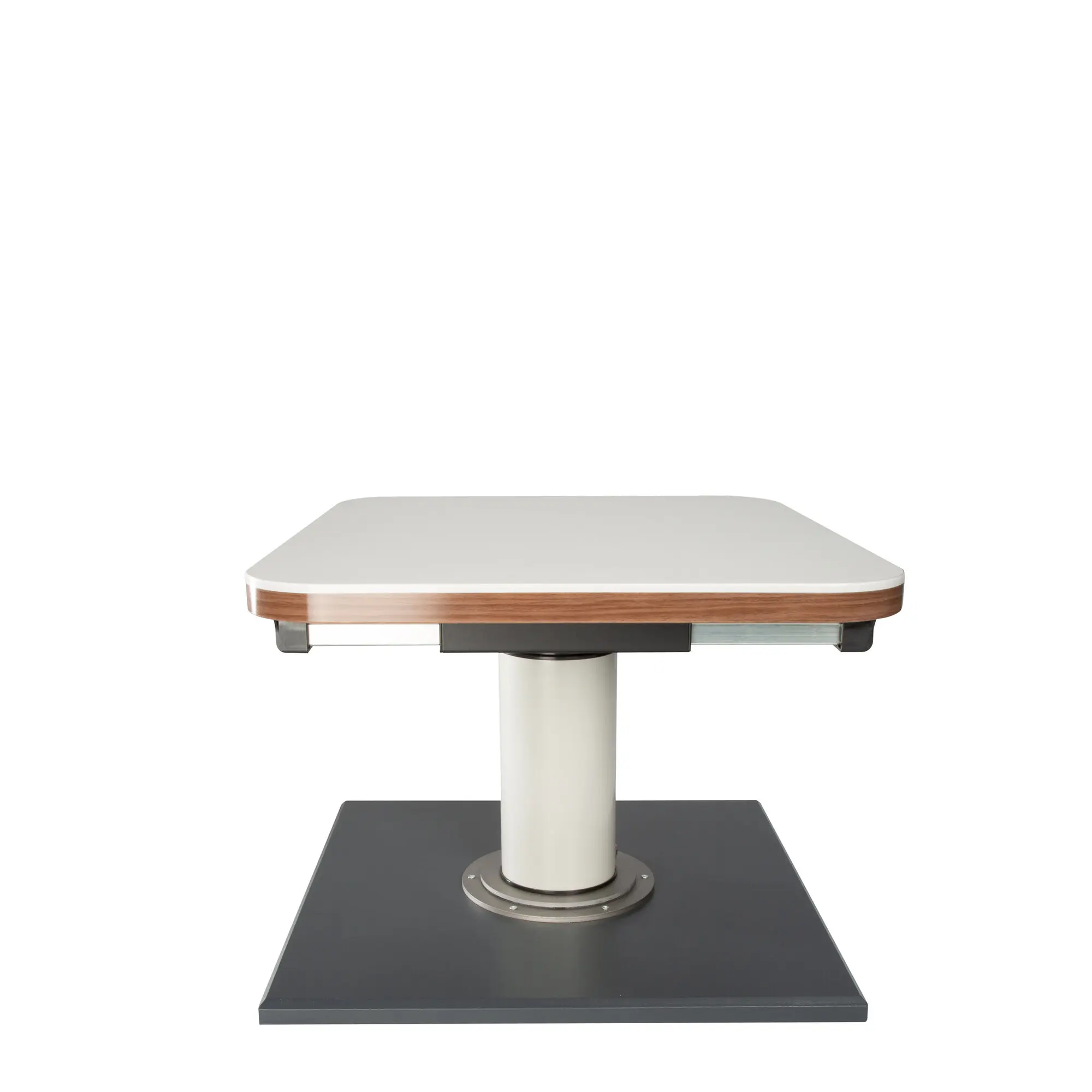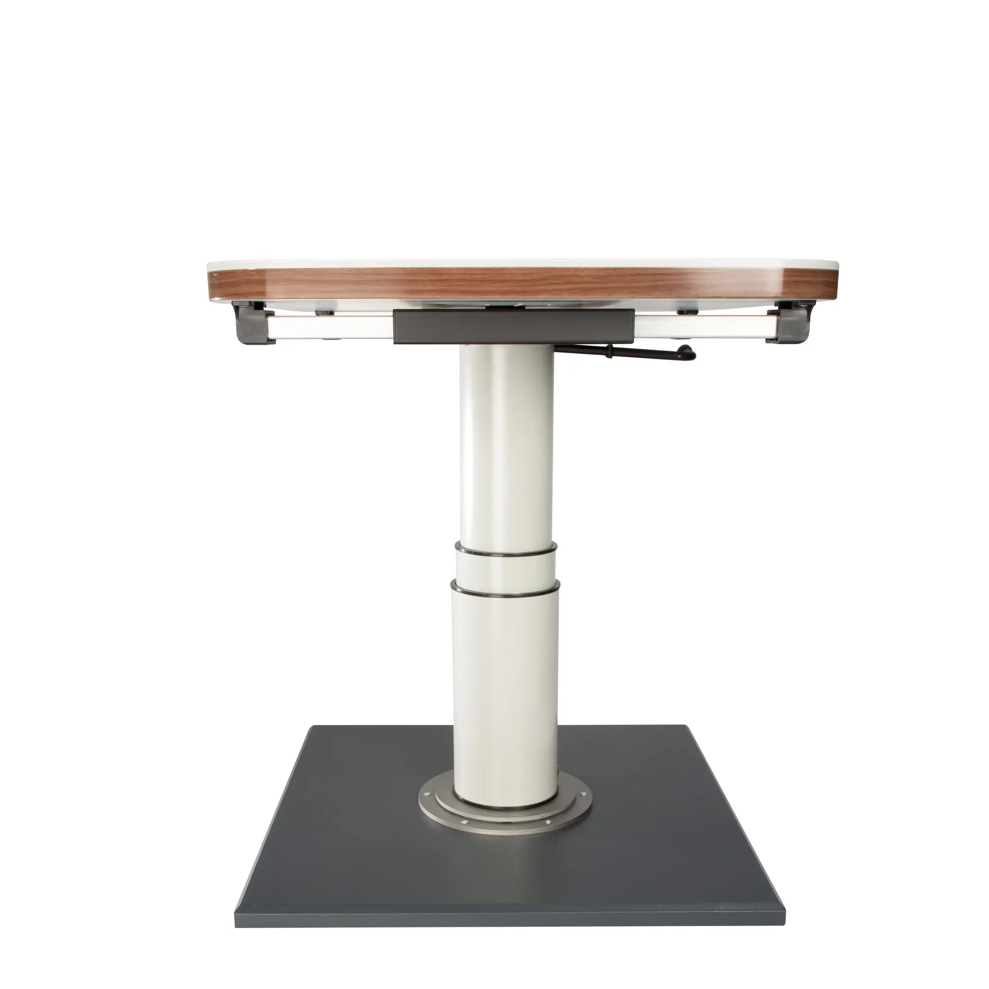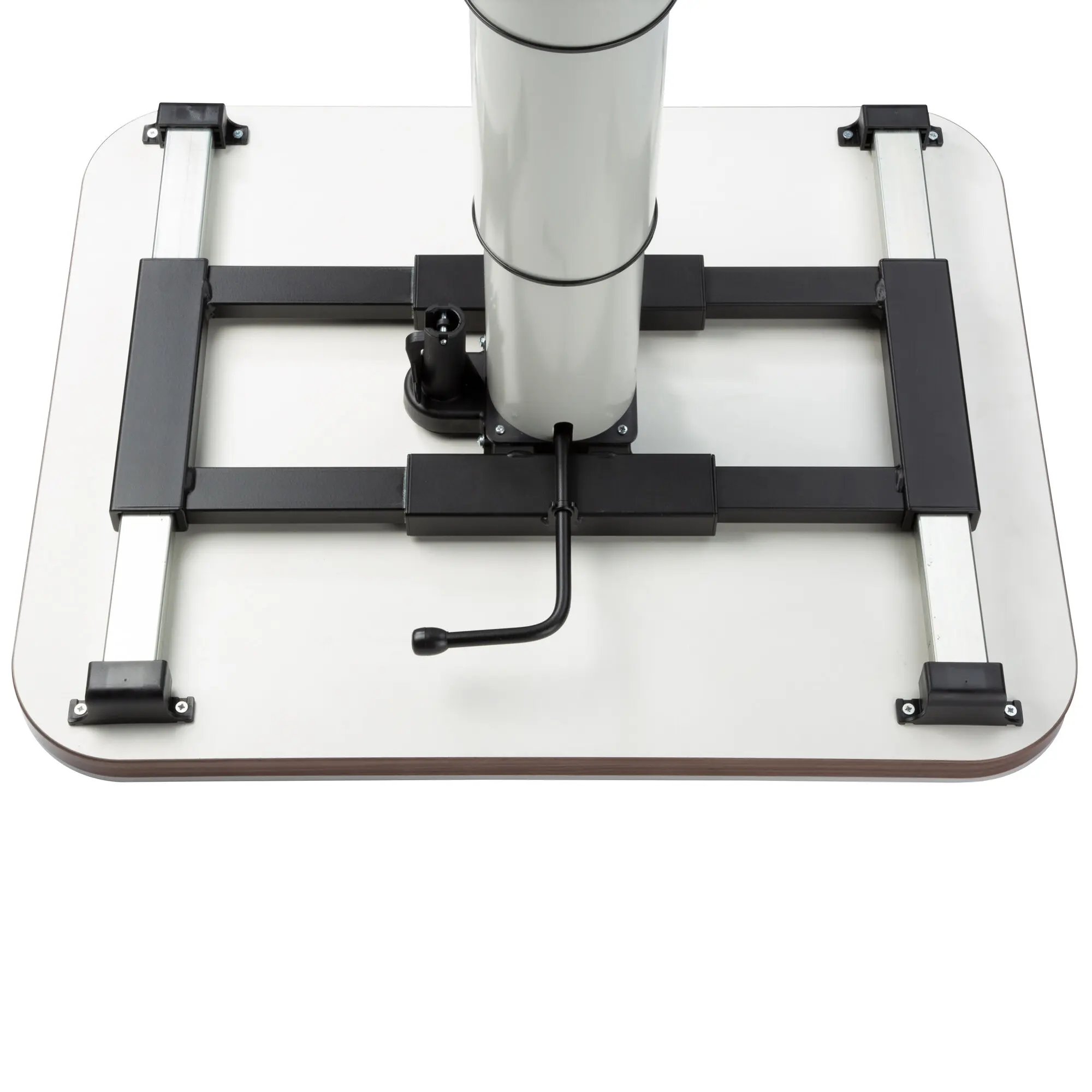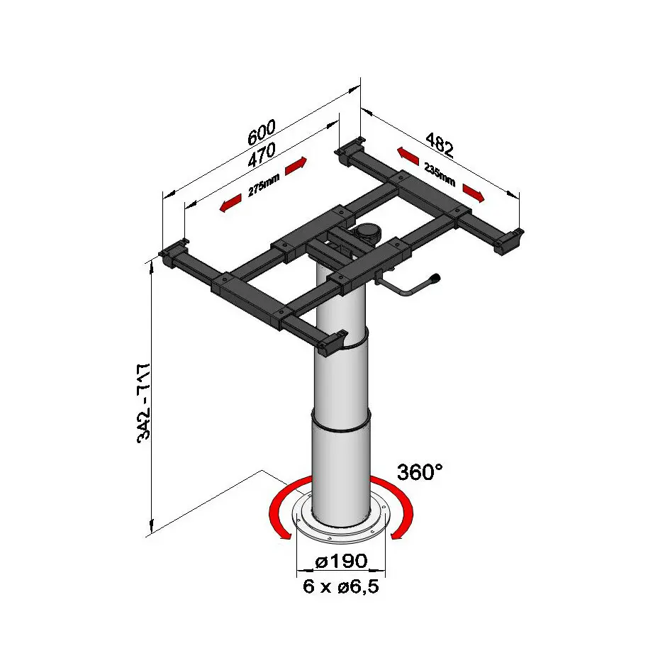 Height-adjustable by 37.5 cm. Bottom height to bottom edge tabletop 34.2 cm. Upper height to bottom edge tabletop 71.7 cm. Table shifting with a central locking system. Vertical and horizontal shifting by 23 cm and 27 cm. Rotatable by 360°. Tabletop and mounting surface not included.