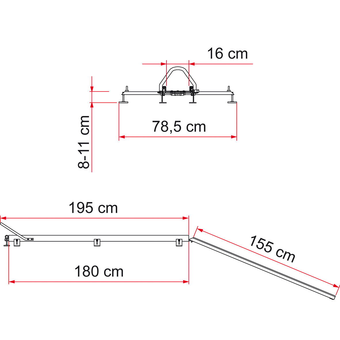 The sliding system consisting of 2 rails is ideal for the rear garage of your motorhome. Easy to assemble thanks to the height-adjustable mounting system. It consists of a support rail (L 180 x W 16 cm), which is mounted in the garage, and a drive-on rail (L 155 cm), which is pulled out by sliding rollers. Made of anodised aluminium. The rail is supplied with two sturdy straps to secure the scooter while driving. For scooters/motorbikes up to 200 kg.