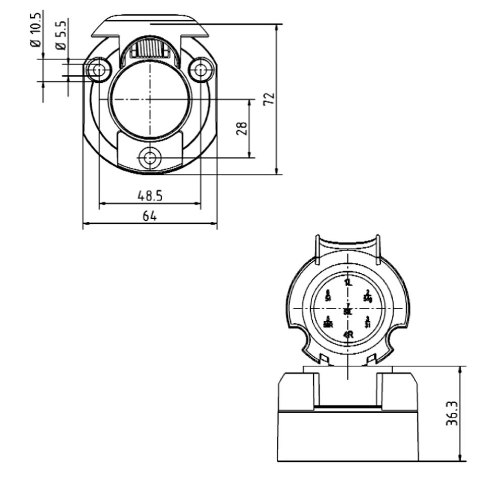 Socket for the electrical connection of towing vehicles and trailers.