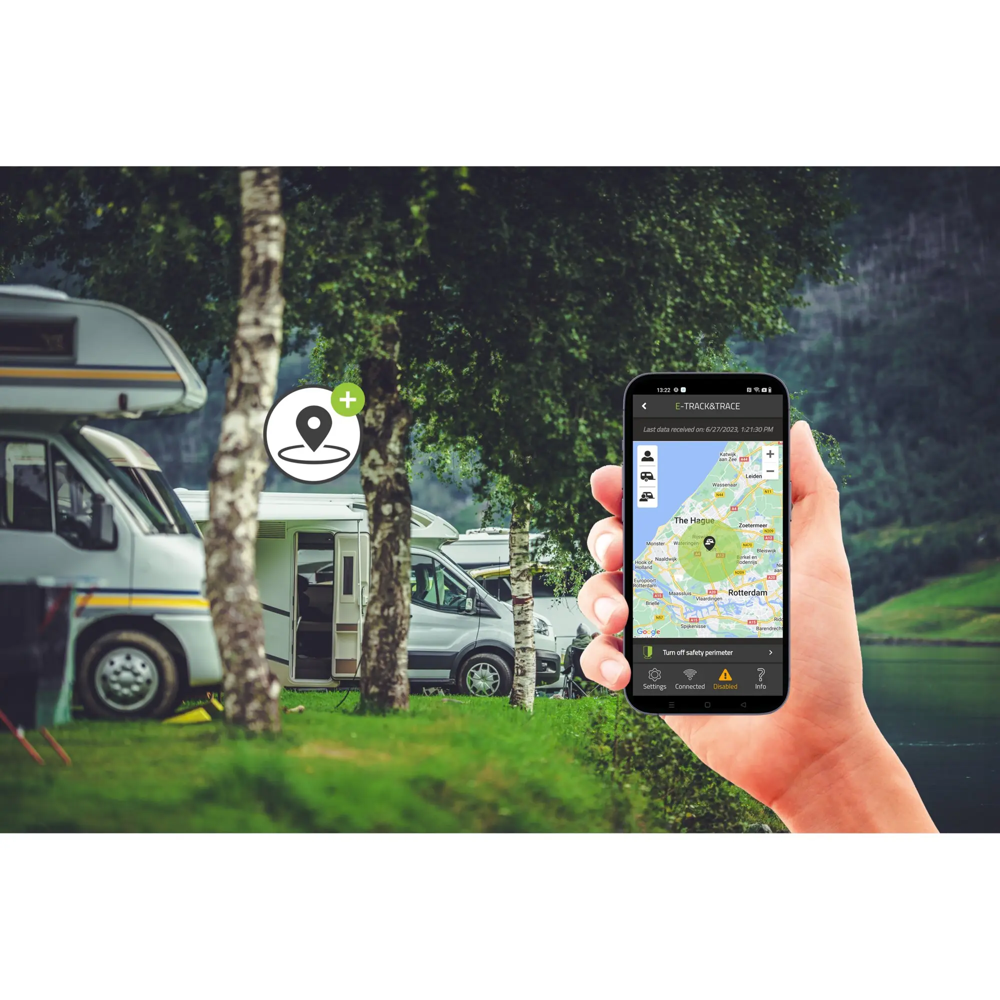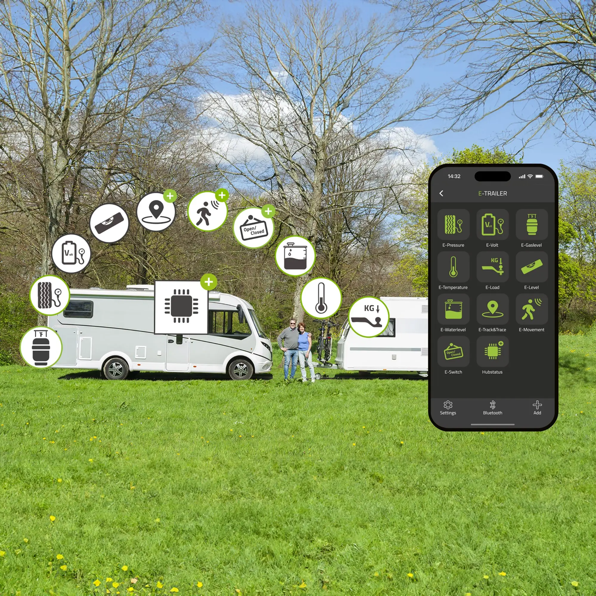 The E-Trailer Starter Pack Plus works with Bluetooth and Internet transmission and thus allows for the remote retrieval of information. The E-Trailer Starter Pack Plus consists of the base station, which is to be installed in the vehicle, the modules E-Volt (battery voltage), E-Level (spirit level) and E-Track&Trace (GPS tracking) as well as the E-Trailer app. In addition, further E-Trailer modules with Bluetooth and Internet connection can be added.