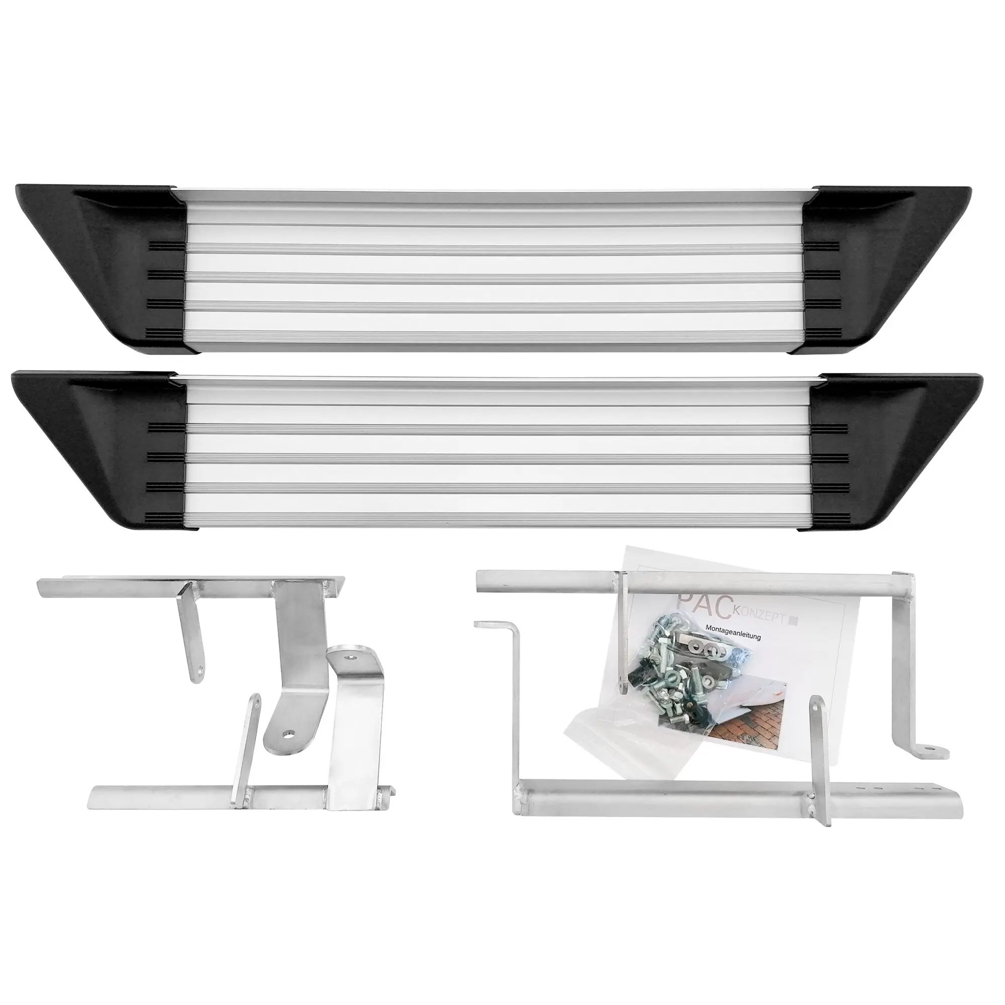 The steps are suitable for the original driver's cabs of Fiat Ducatos built since 2006, Mercedes Sprinters built since 2006 and VW Crafters built between 2006 and 2016 as well as of vehicles with identical construction. Aluminium profile with screwed synthetic safety cover at the edges and anti-slip profile. The steps are screwed safely to and under the vehicle's crossbeam via the vehicle-specific brackets included in delivery. The problem: due to their construction, the Fiat Ducato's, Sprinter's and Crafter's first steps are situated inside the driver's cab at a height of 46 – 51 cm above ground. To surmount this height difference, drivers often misuse their steering wheel to climb into the vehicle. This is not possible for the passenger, as no such aid is within their reach. Due to the height difference of 46 – 51 cm, climbing into the vehicle is uncomfortable and tiring. The solution: with these steps, the height difference is cut down to approx. 23 cm. The steps are adaptable and vertically adjustable to the existing vehicle construction. This is done via entirely vertical profiles at the bottom of every step. Thus, the set of steps can be adjusted specifically to the different vehicle bodies. Consists of: 2 anodised aluminium steps (driver's and passenger's side); 2 sets of stainless steel brackets; fastening material; manual illustrated in colour; drilling template; Vehicle Type Approval; maximum bearing load per step: 140 kg.