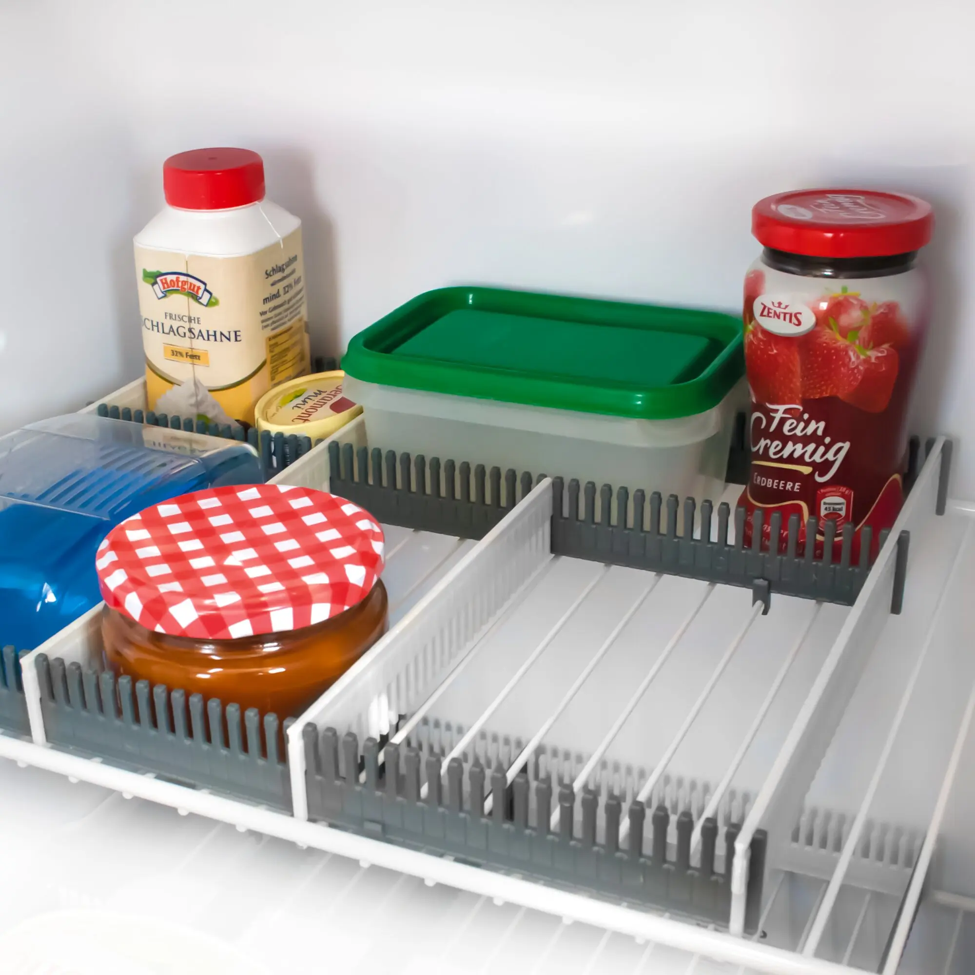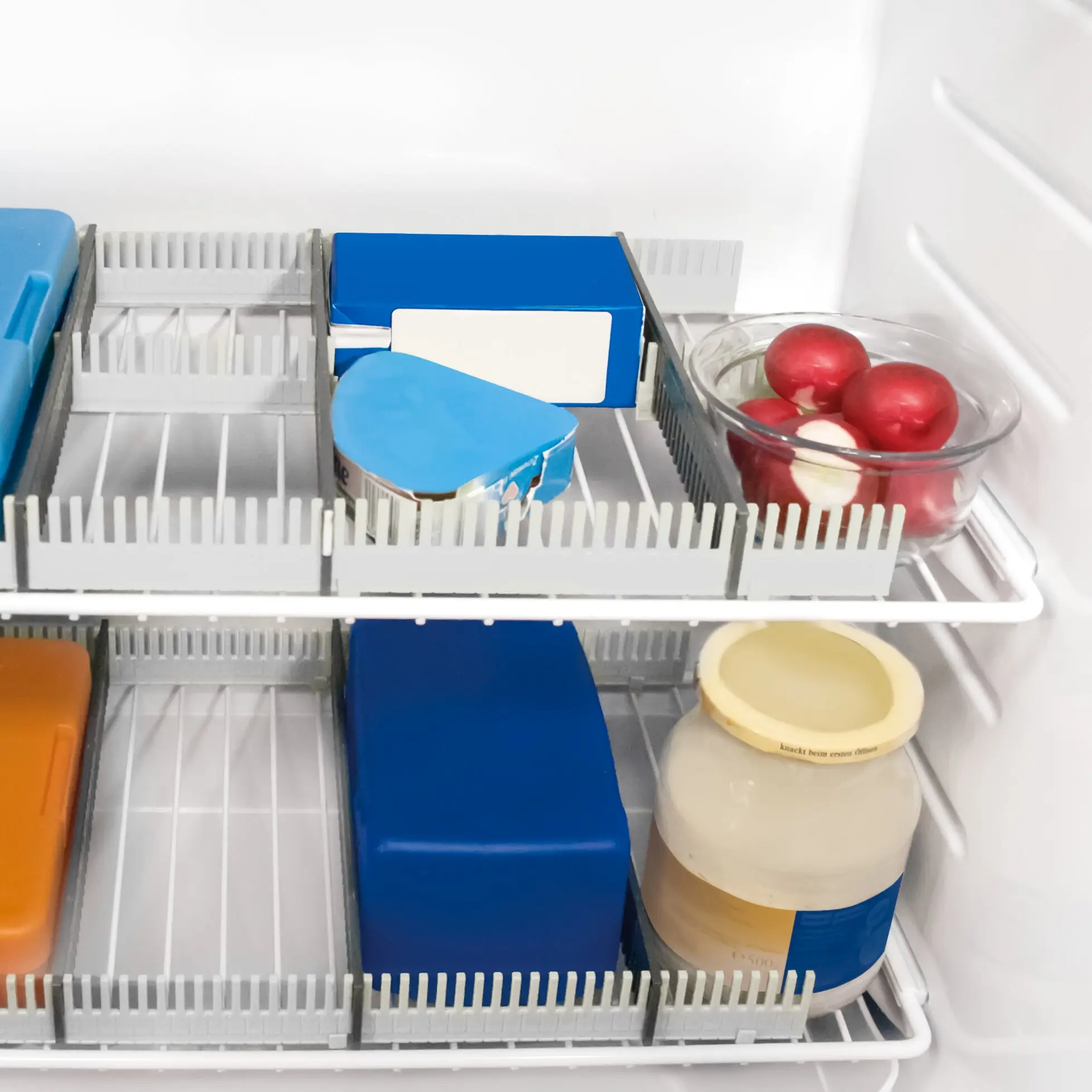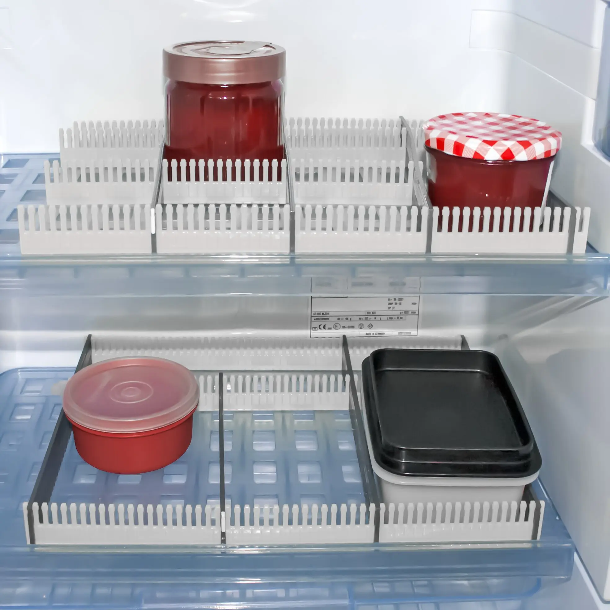 The stow bar with fastening clips allows you to organise your fridge. Ideal for all kinds of food, preserving jars, containers, etc.