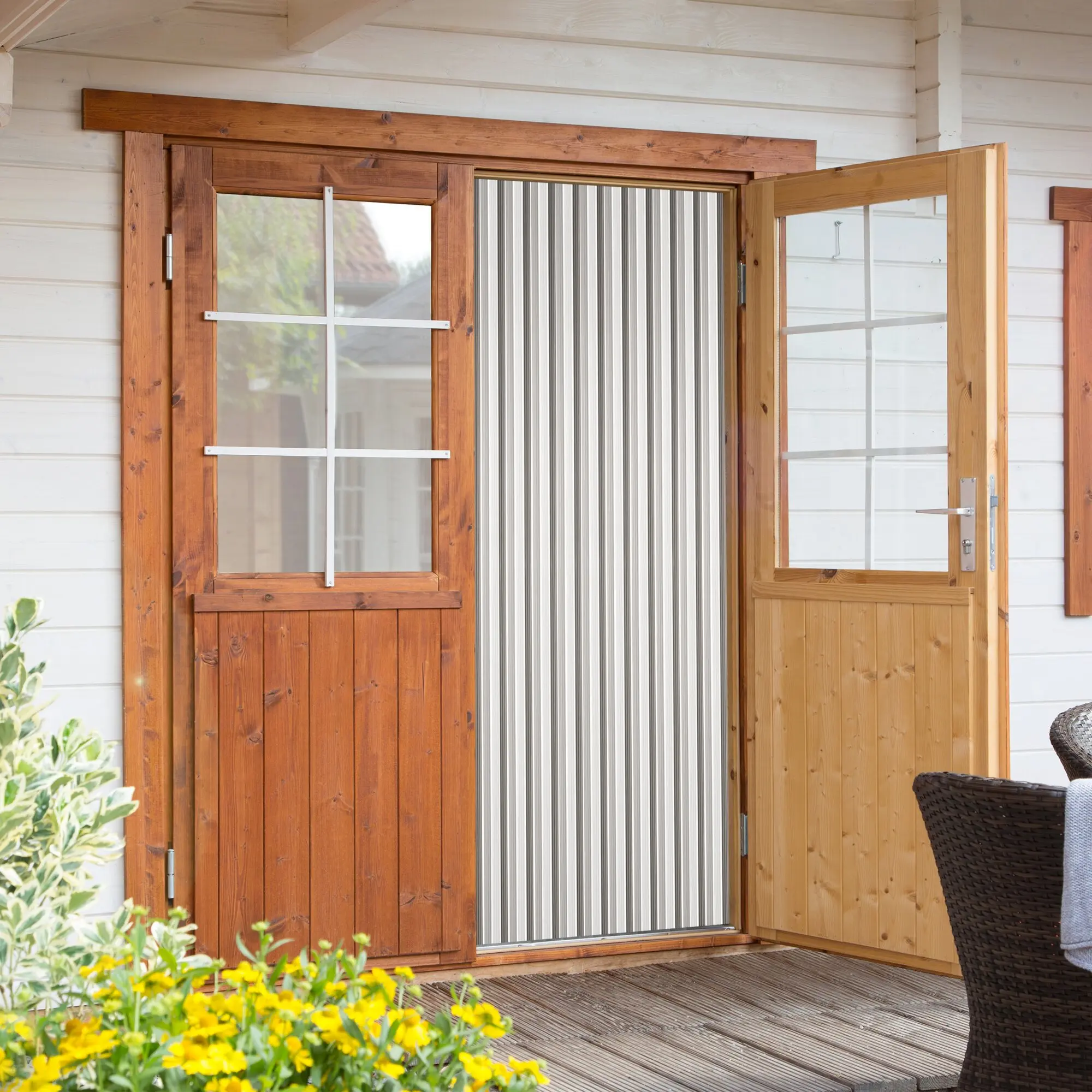 Pure nostalgia or just like at grandma's. Thanks to the 3 different colours, there is something for everyone. The strip curtains do not tear when they are accidentally caught in the door and do not clatter. With attachment rail, 34 profiled strands. PE foil. The mounting material is included in delivery.