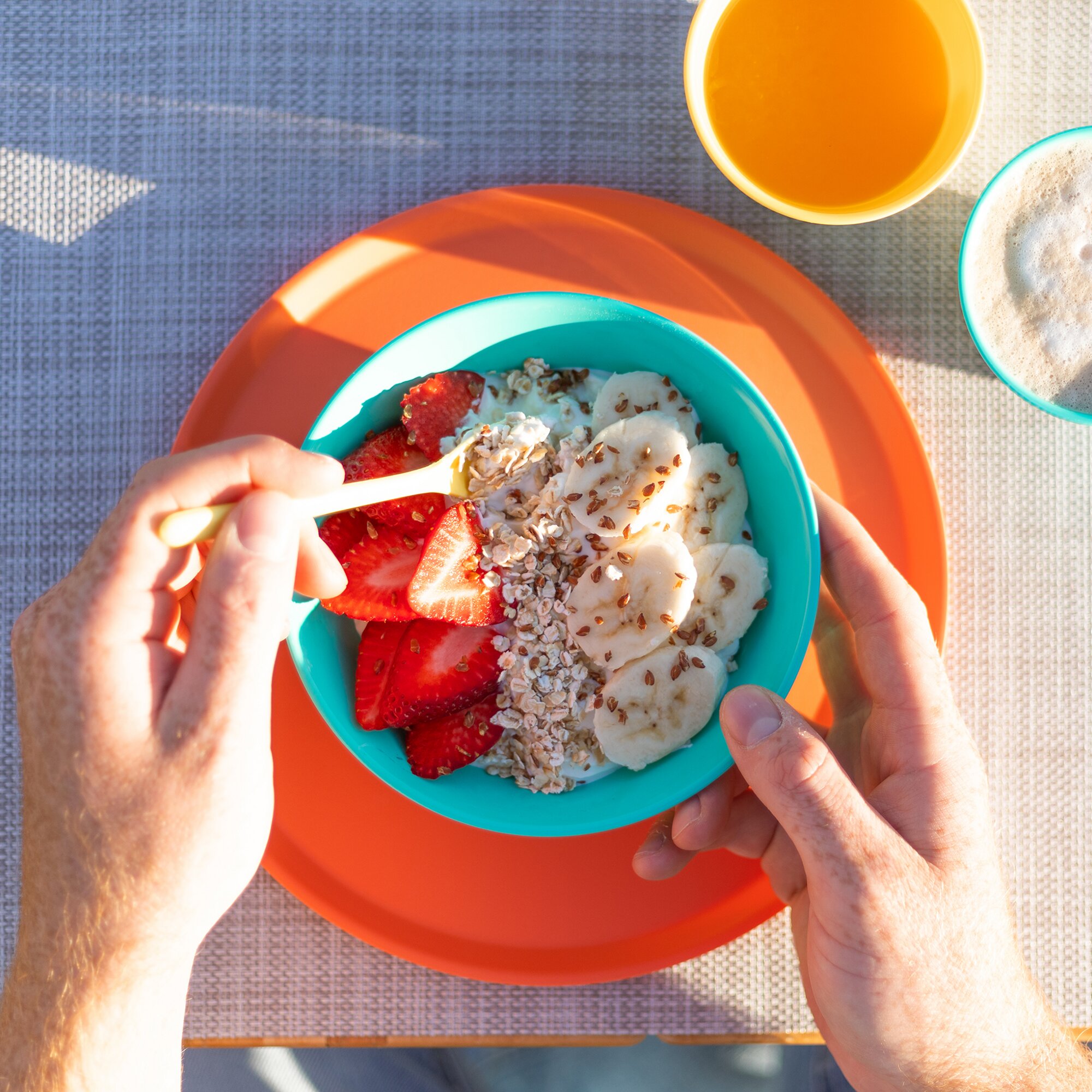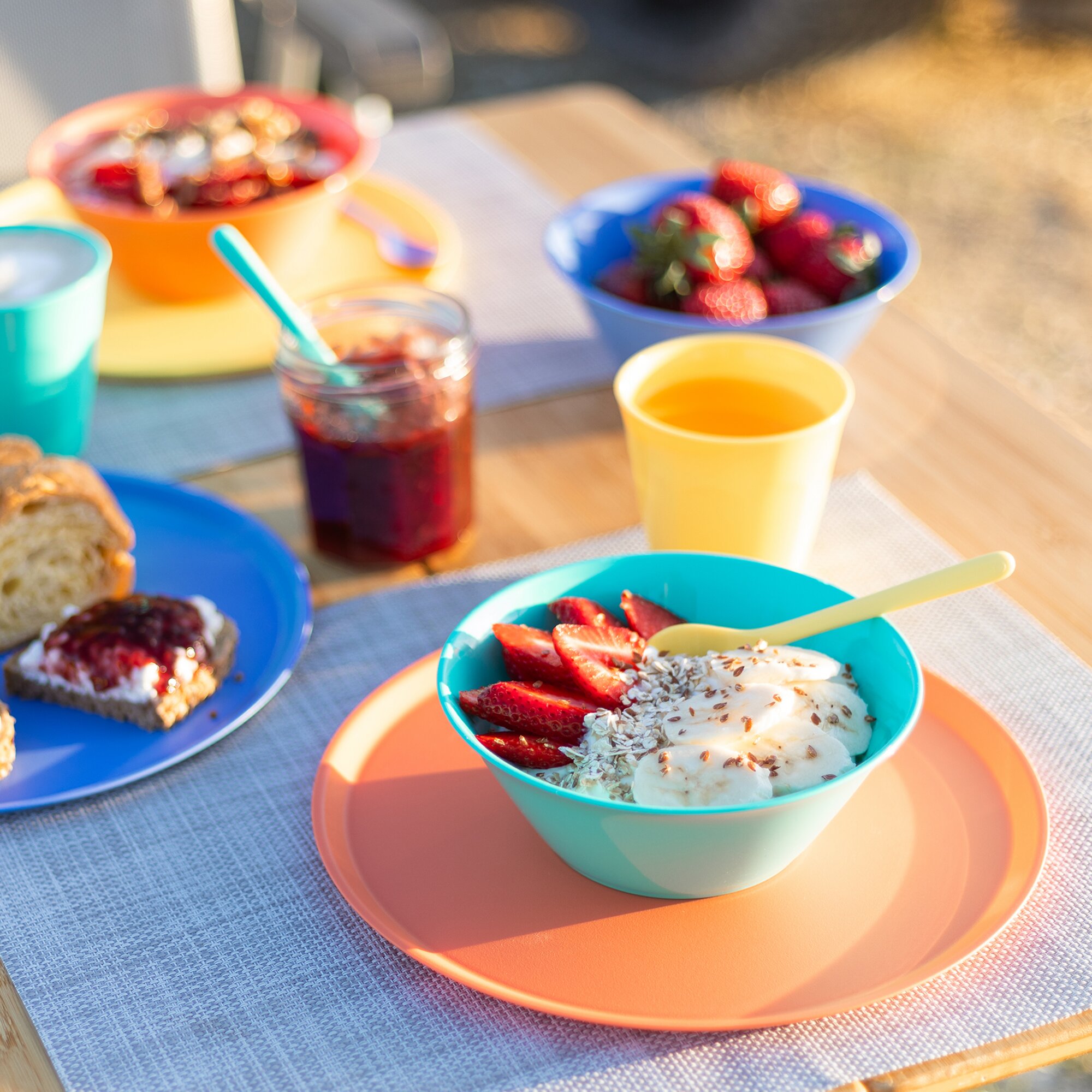 Pure joie de vivre – the cups, bowls, plates and spoons can be combined to your heart's content. The small plate is ideal for fruit, snacks or cakes and the small bowl quickly makes itself indispensable for muesli or desserts. The small cup has a pleasant feel and sits very well in the hand. Everything is stackable, lightweight and unbreakable, making it perfect for garden parties, picnics and camping. The material is environmentally friendly and absolutely free from melamine and bamboo.